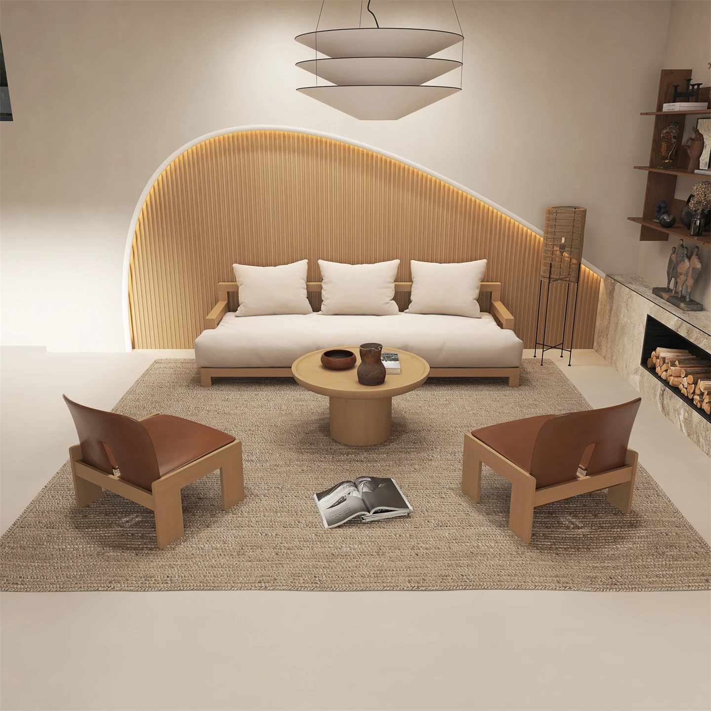 侘寂風の民宿会所 - 自然木の温もりを感じるラウンジソファで、心地よいひとときをお過ごしください。お客様をおもてなしする特別な空間です。