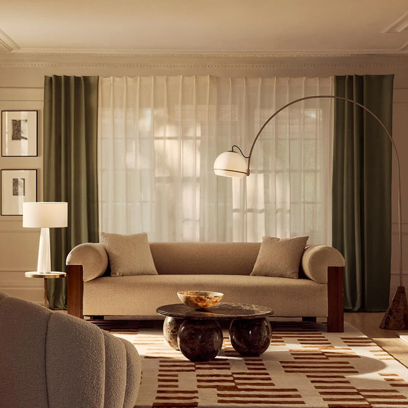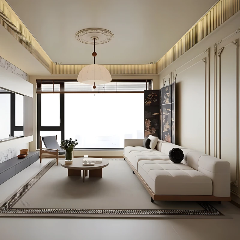侘寂風デザインのソファー - 天然木製、洗練された和モダンスタイルの客間用。ホテルや民宿の接客・談話に最適な布製直排ソファー。心地よい空間を演出し、ゲストを魅了します!
