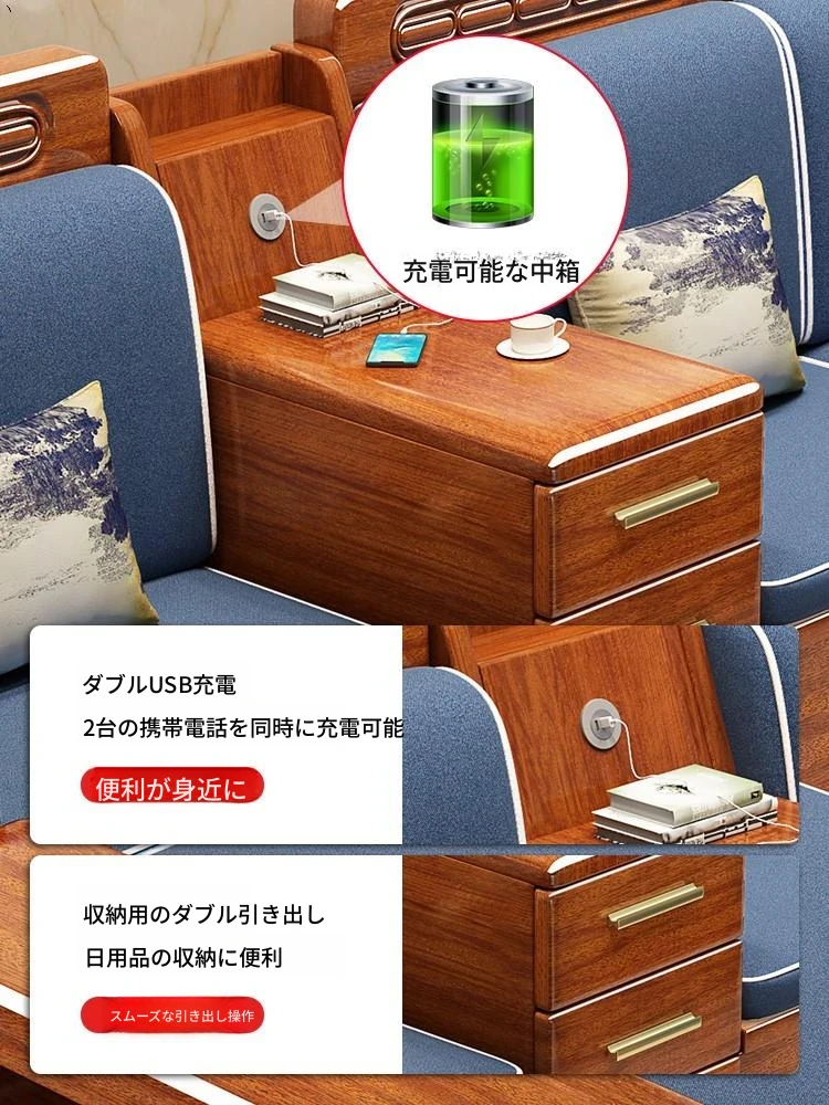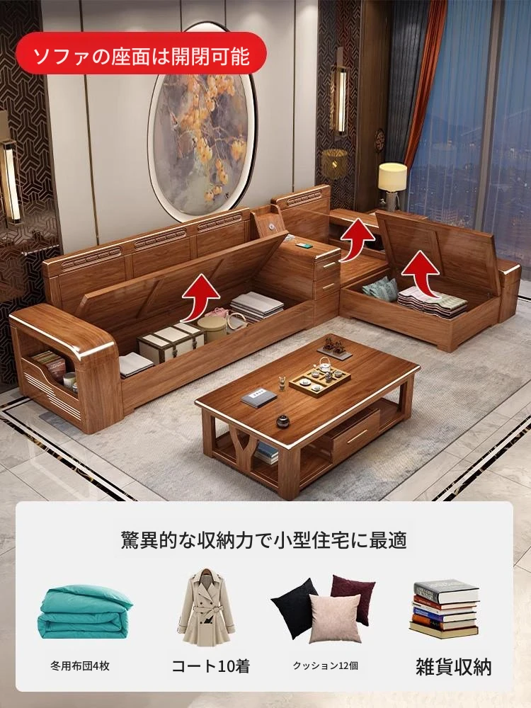 新中式デザイン!小スペースにぴったりな実木ソファ。冬も夏も快適、収納機能付きでお部屋をスッキリ!モダンな客リビングに最適な家具です。