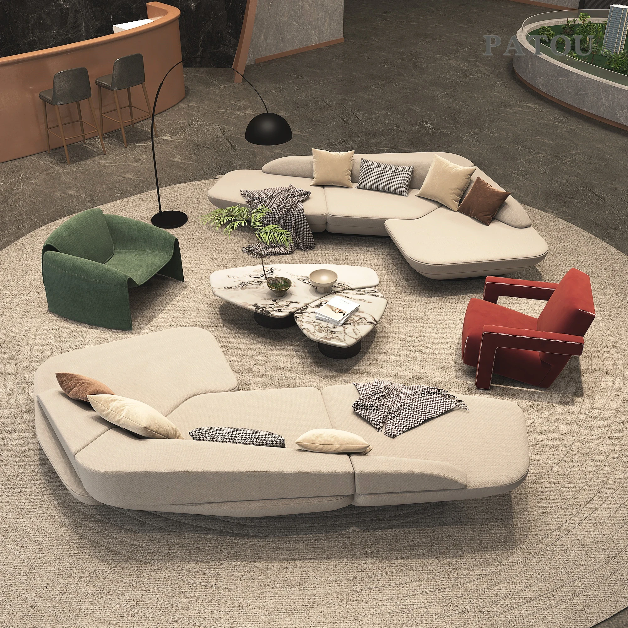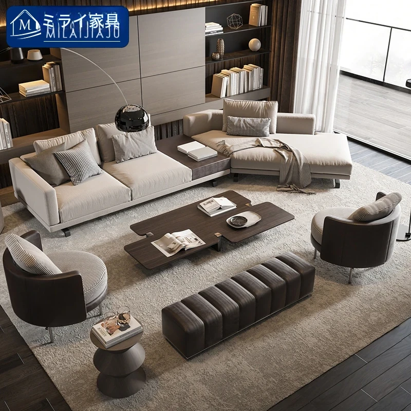 イタリアンミニマリズムの軽奢感漂うユニークなコーナー布製ソファセット - 大平面ホテルロビーやサロンに最適なデザイナーズスタイル!おしゃれで洗練された空間を演出します。