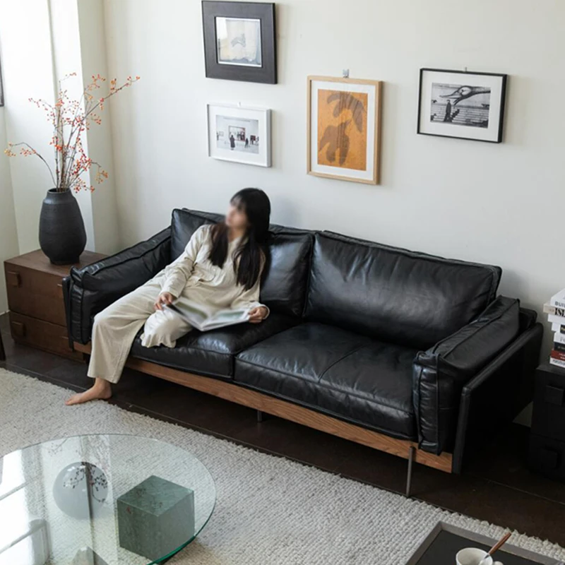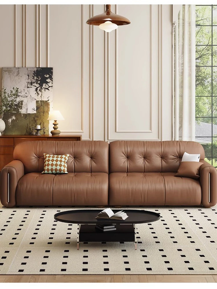 オイルレザーソファ イタリアンミニマリズム フレンチヴィンテージ 本革ソファ アンティーク風 小型住宅向け ストレートソファセット - 上質なデザインでおしゃれな空間を演出!