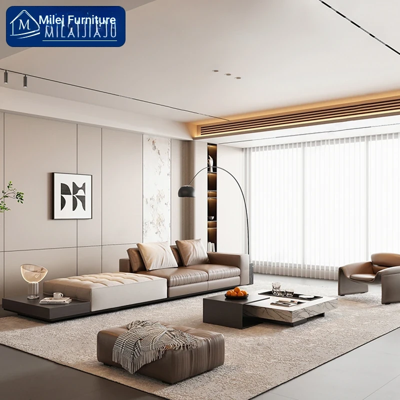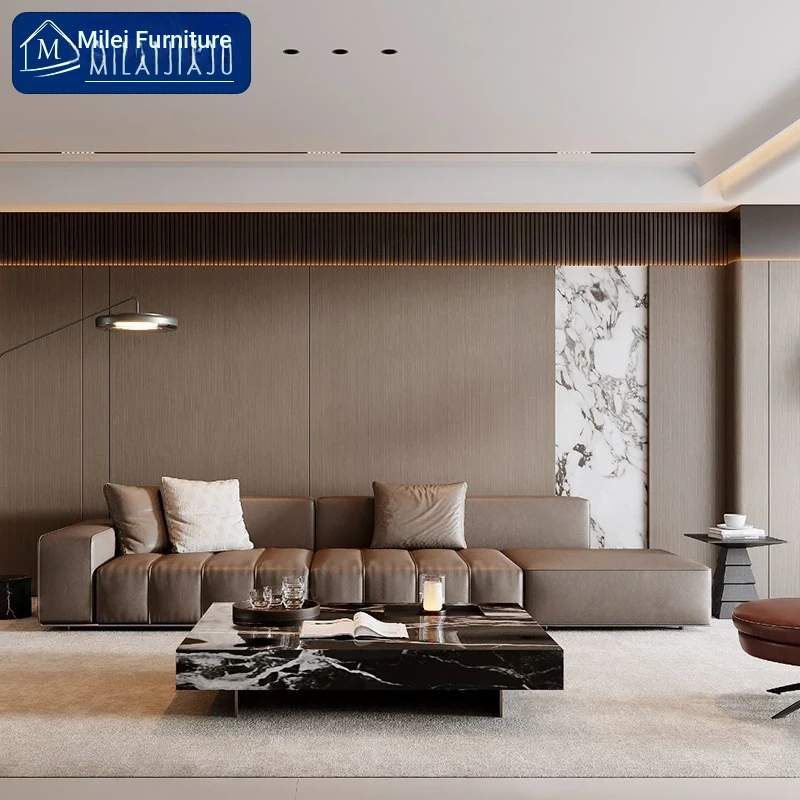 Italian Minimalist Straight-Line Leather Sofa Set for Home Living Room - Modern Office Reception Chairs with Luxurious Aesthetic and Comfort