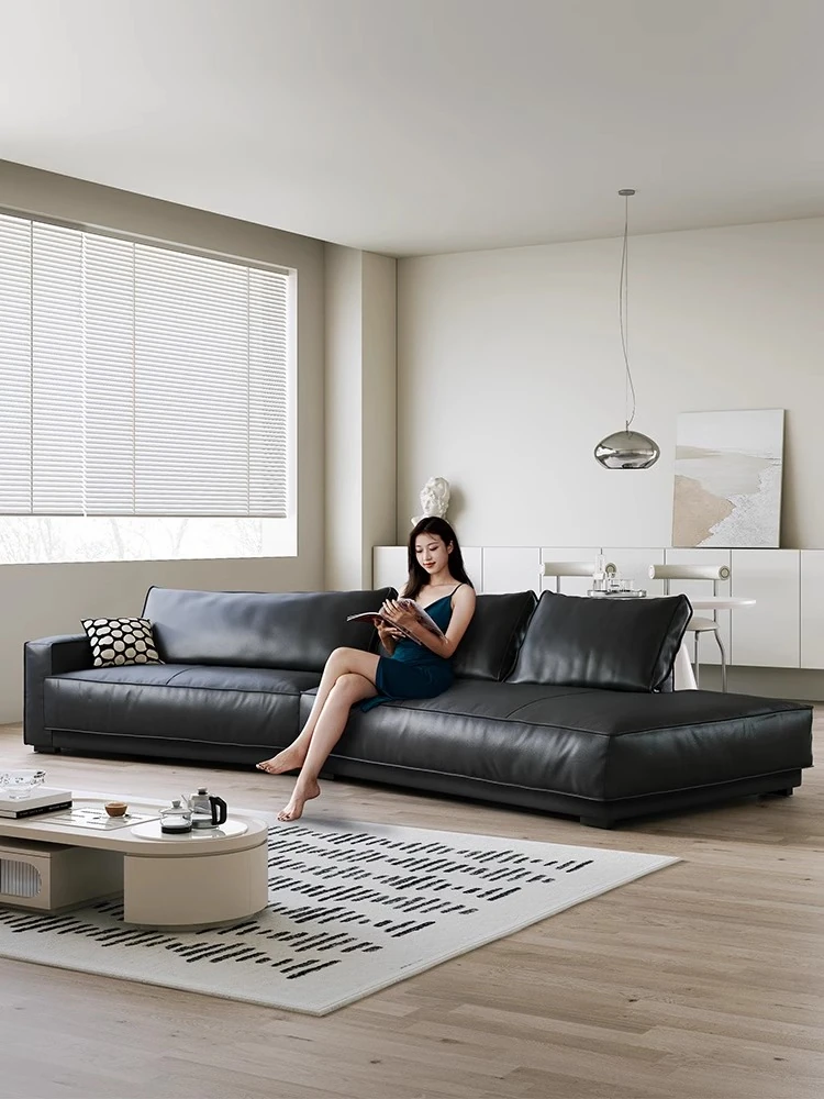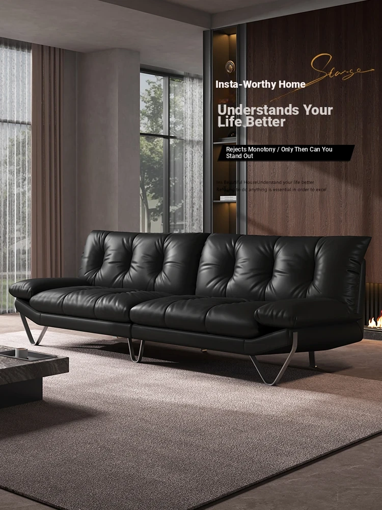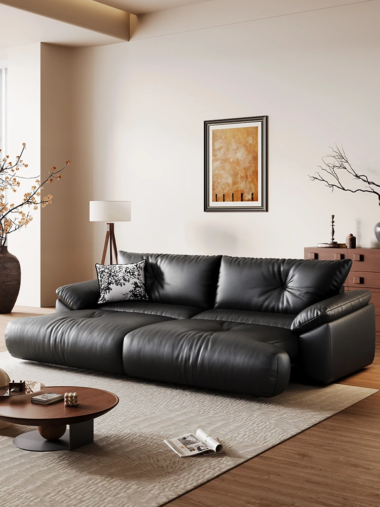 Italian Minimalist Genuine Leather Sofa - Modern Retro Style Black Cloud-Shape Sofa for Small Living Rooms