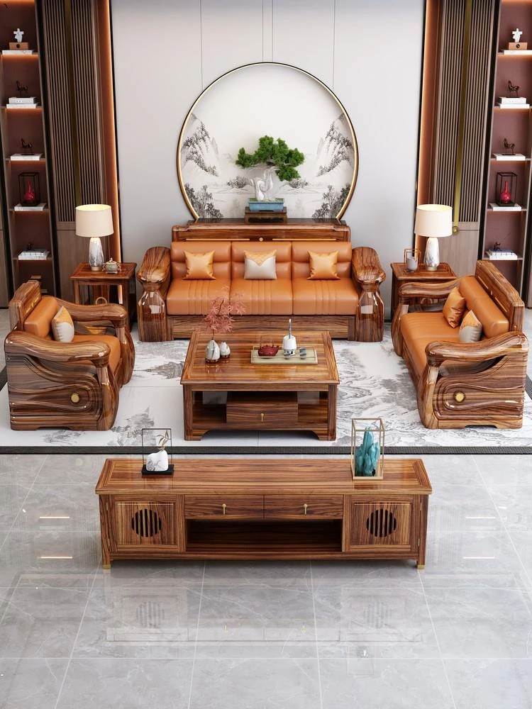 New Chinese Style Solid Wood Sofa in Black Gold - Versatile for Summer and Winter, Ideal for Spacious Villas with Storage Solutions - 2025 New Arrival