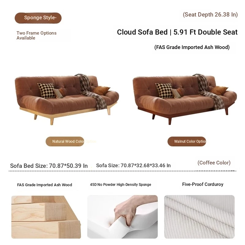 70.87 in sofa bed | Brown [five-prevention wash-free corduroy-sponge] all solid wood sofa