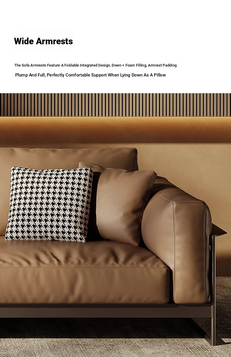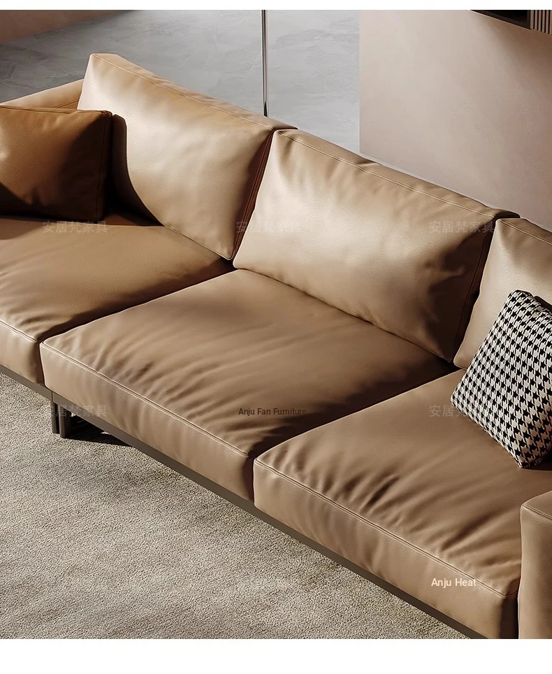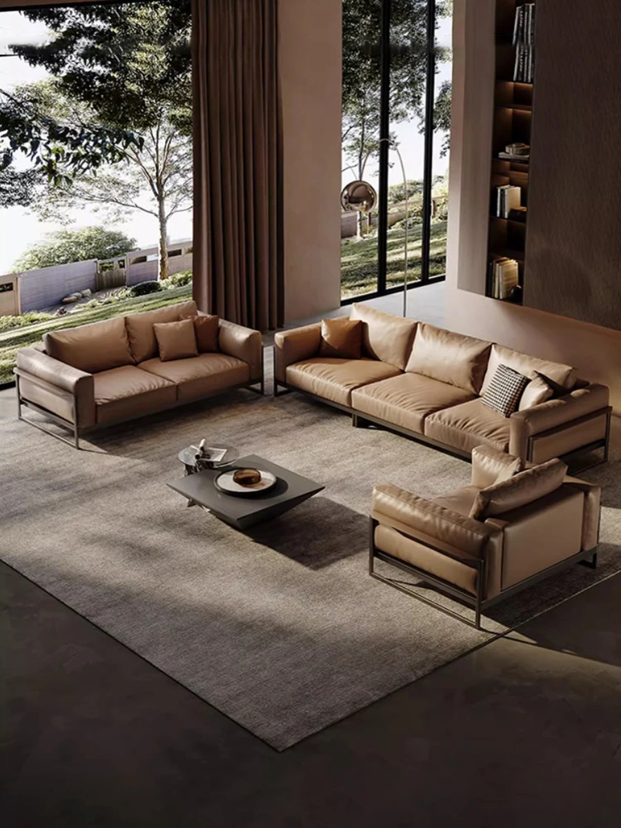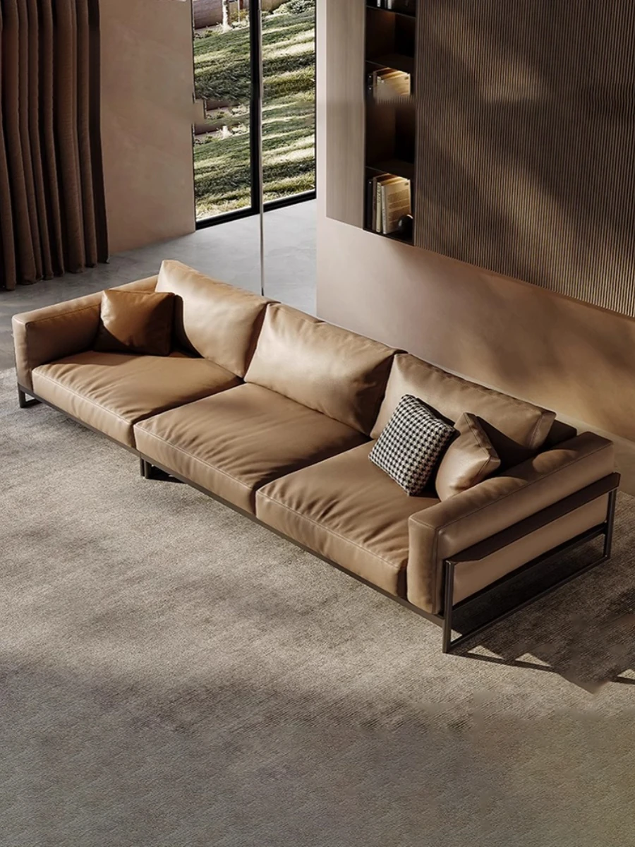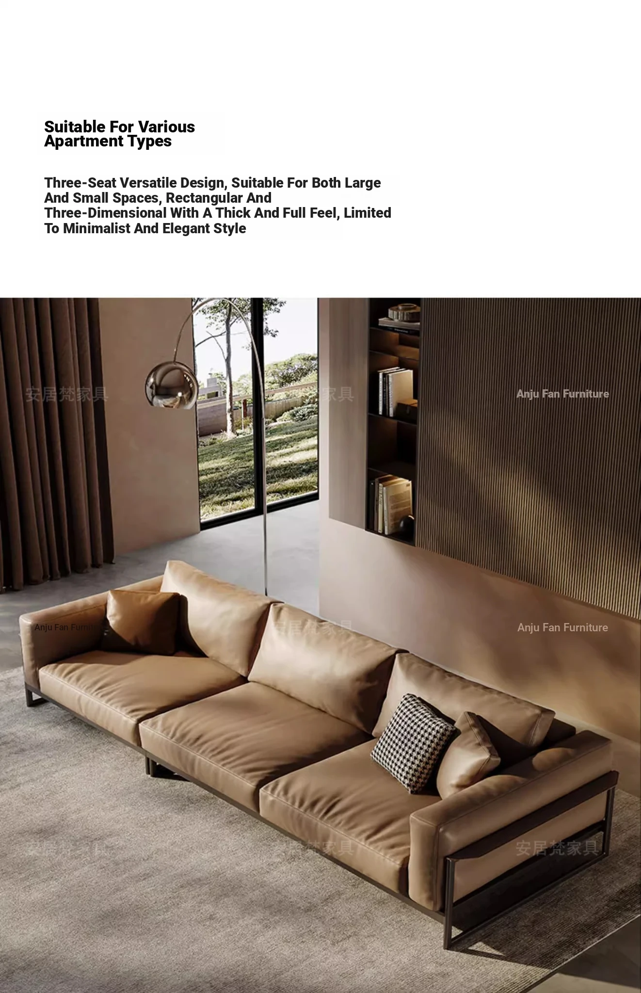 Italian Minimalist Genuine Leather Sofa - Modern Luxury Design with Top-Grain Cowhide, Perfect for Spacious Living Rooms; Features Down-Filled Cushions and Sturdy Steel Frame.
