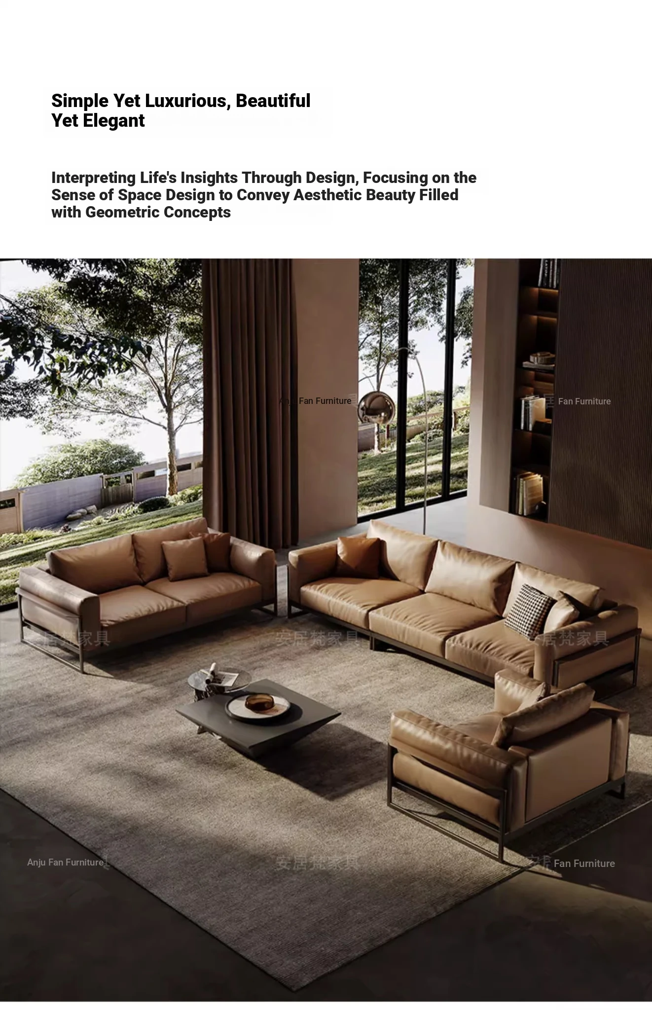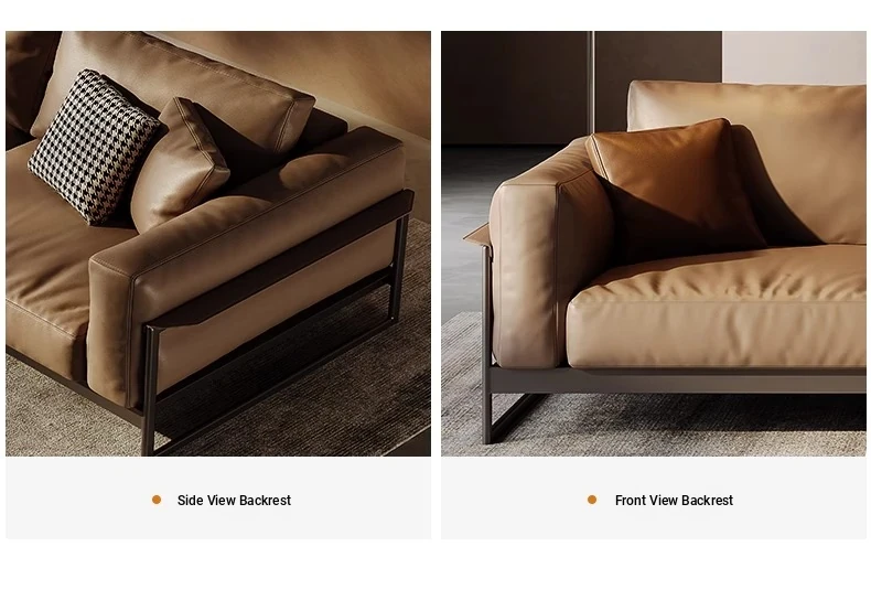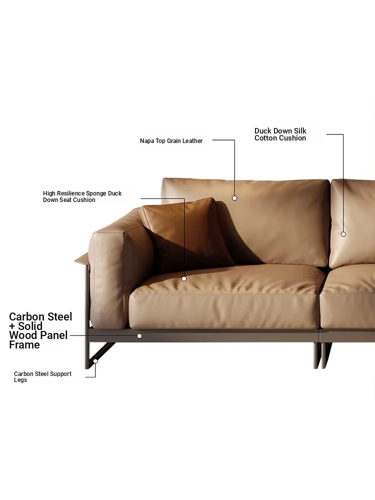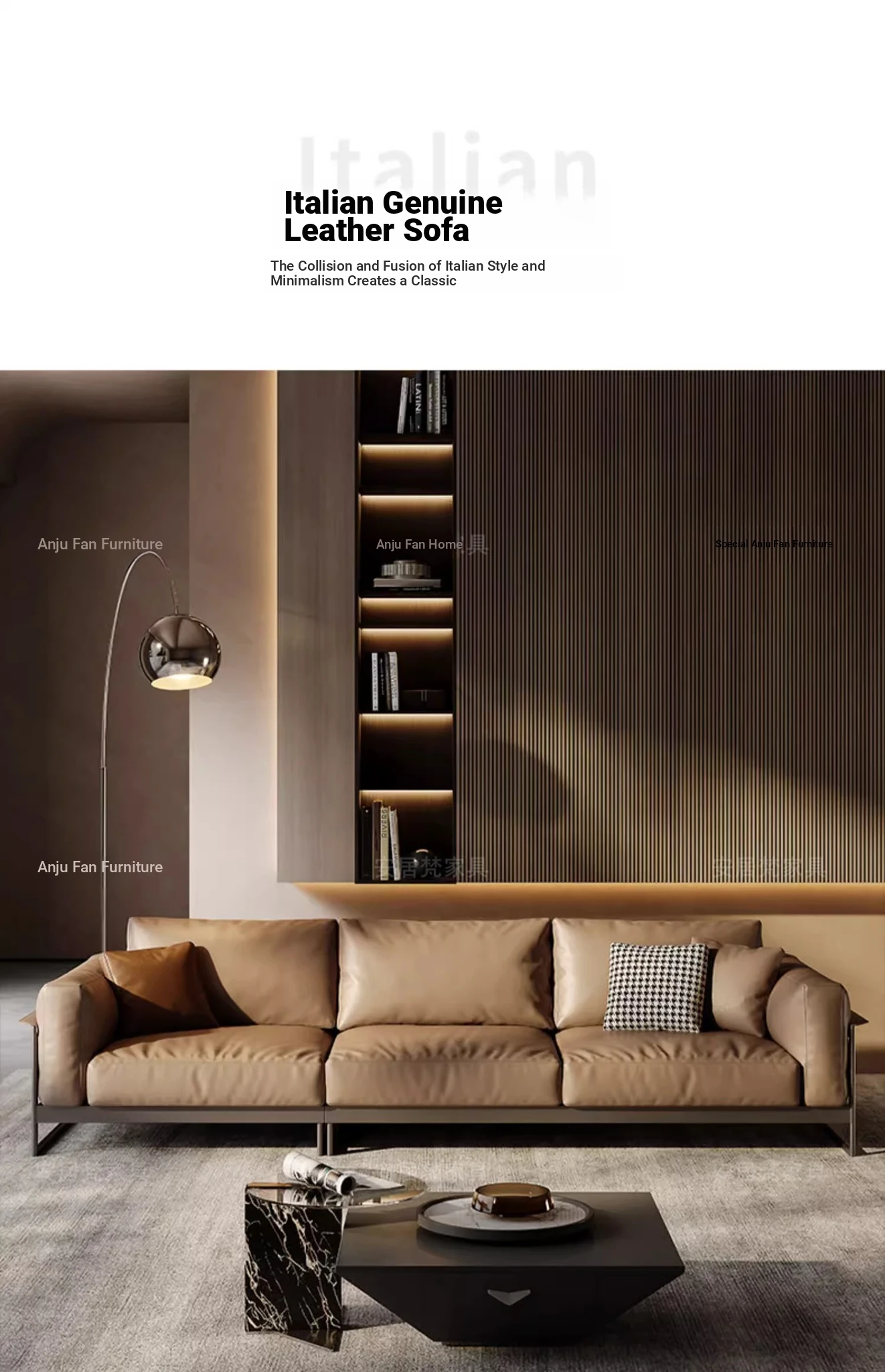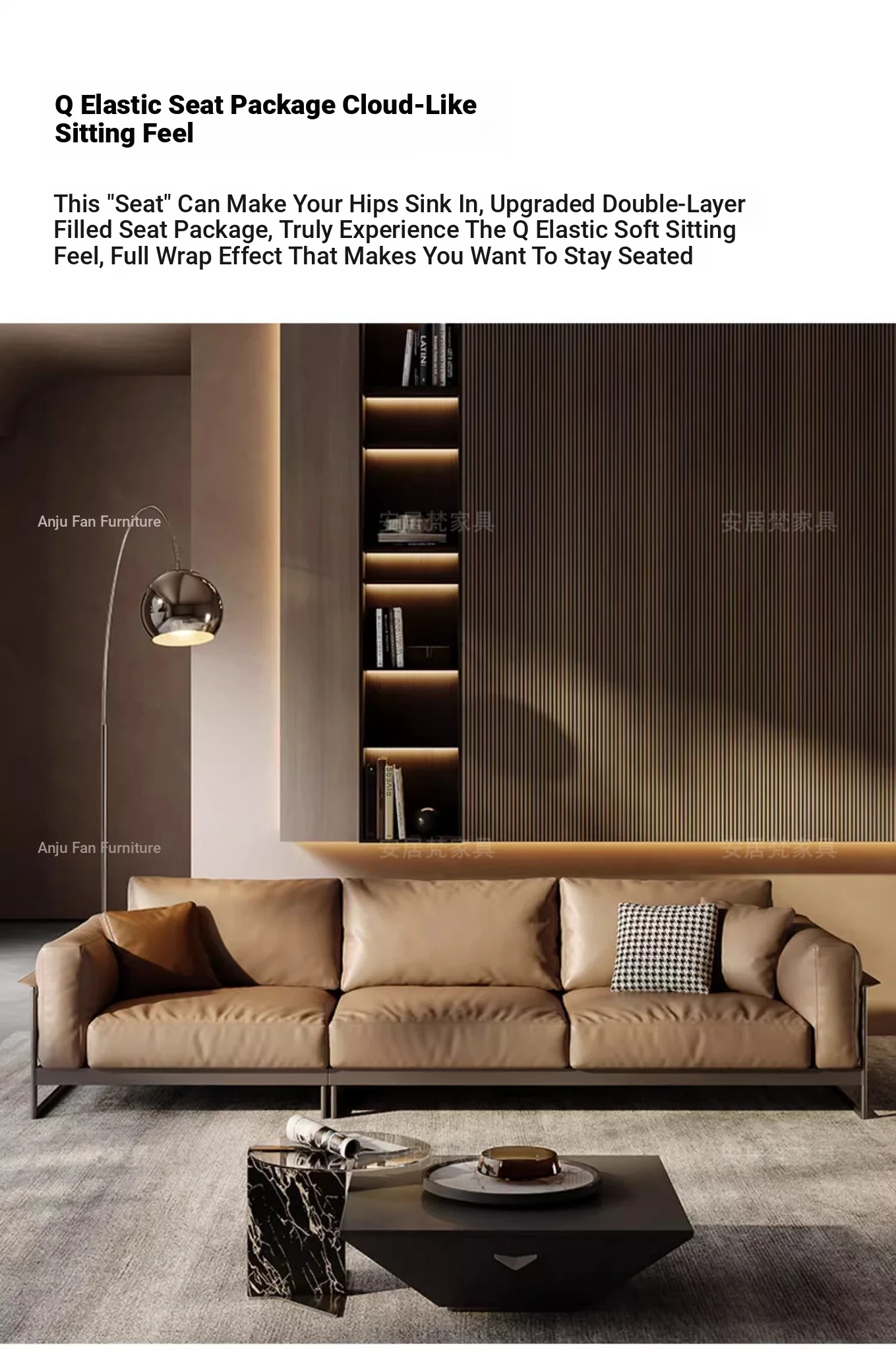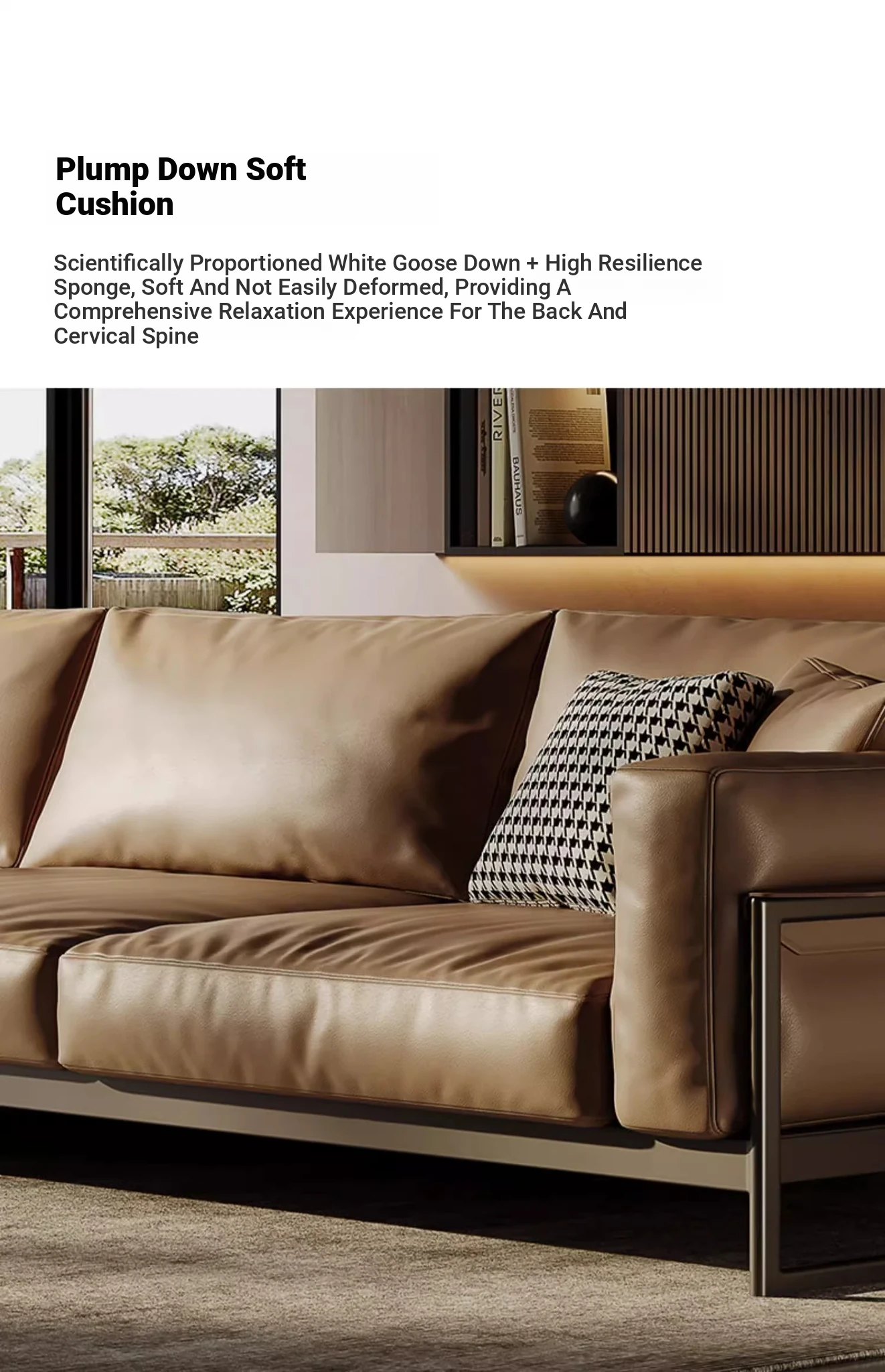 Italian Minimalist Genuine Leather Sofa - Modern Luxury Design with Top-Grain Cowhide, Perfect for Spacious Living Rooms; Features Down-Filled Cushions and Sturdy Steel Frame.