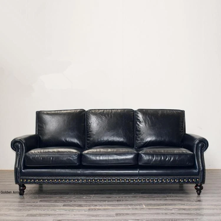 Vintage American Genuine Leather Sofa Set - Top Grain Cowhide 3-Seater Living Room Furniture with Retro Waxed Finish