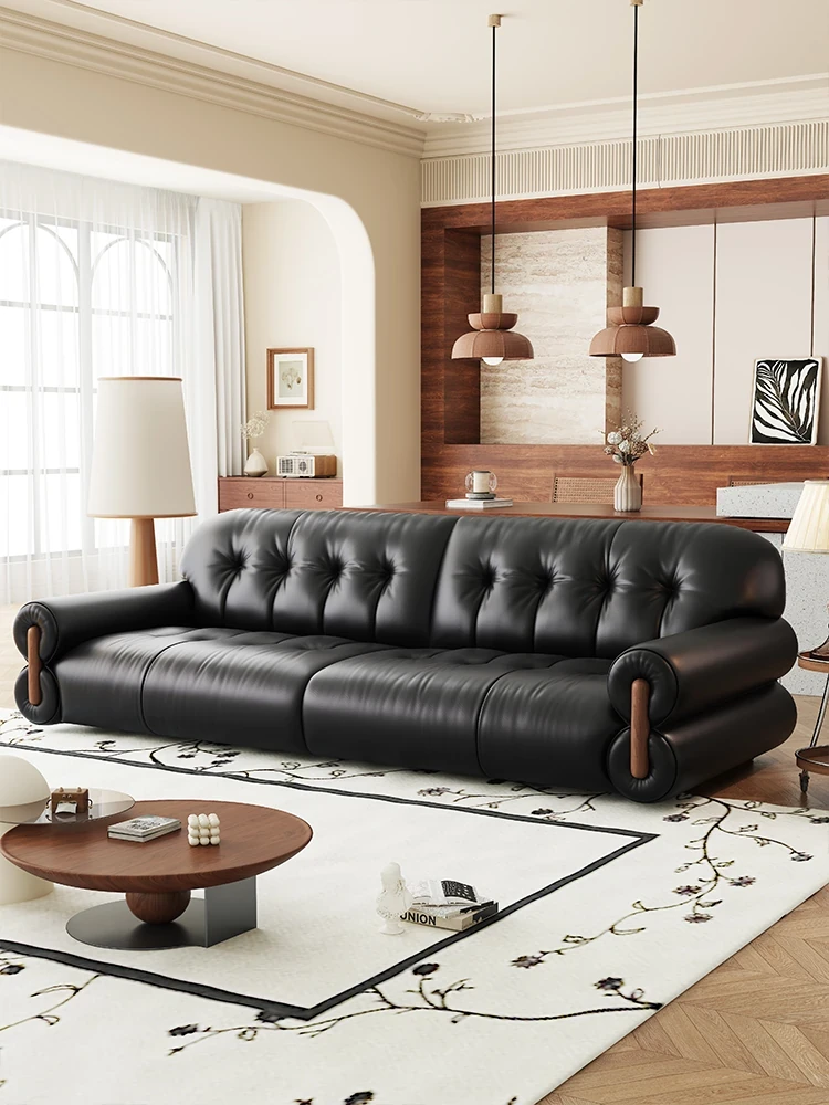 Black Sugar Sofa - Italian Minimalist & French Vintage Style Genuine Leather Sofa, Top Layer Cowhide, Black American Cloud Sofa - Elegance Meets Comfort in Every Detail!