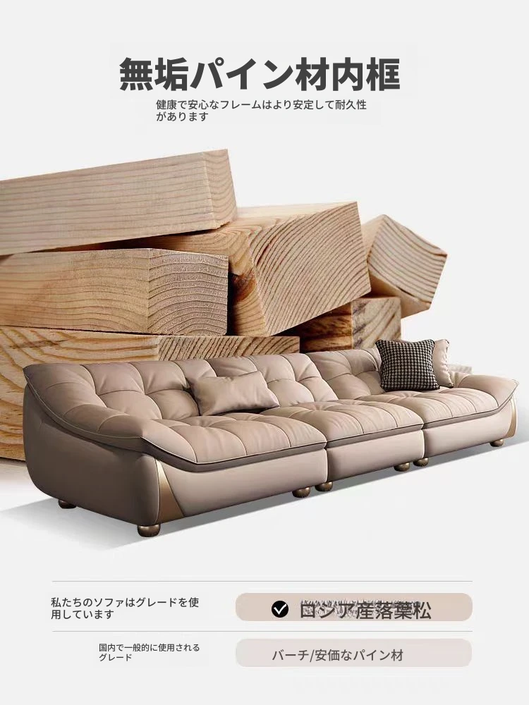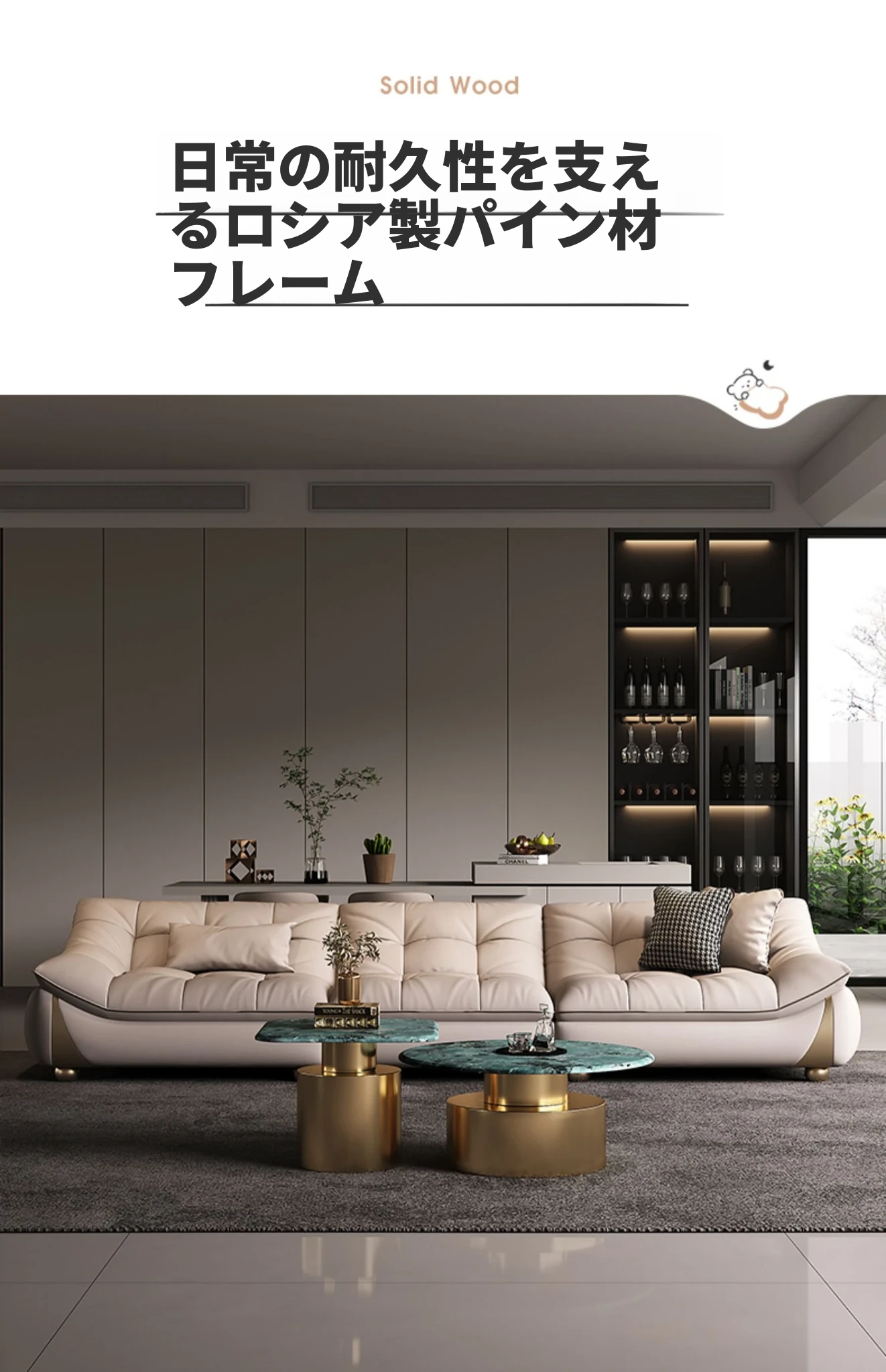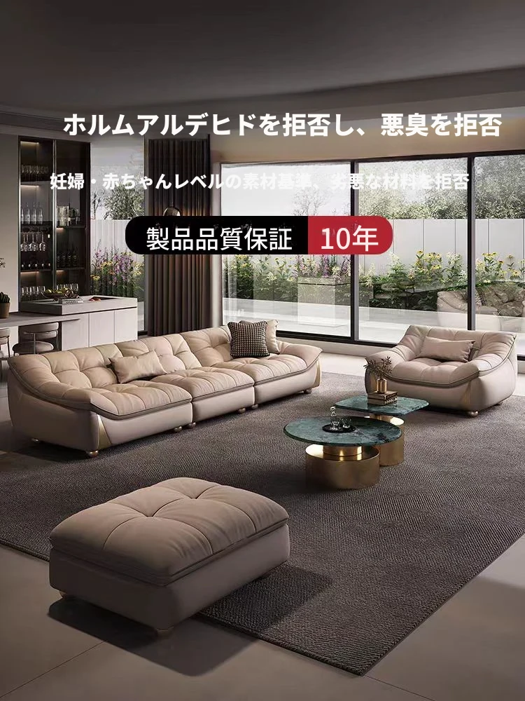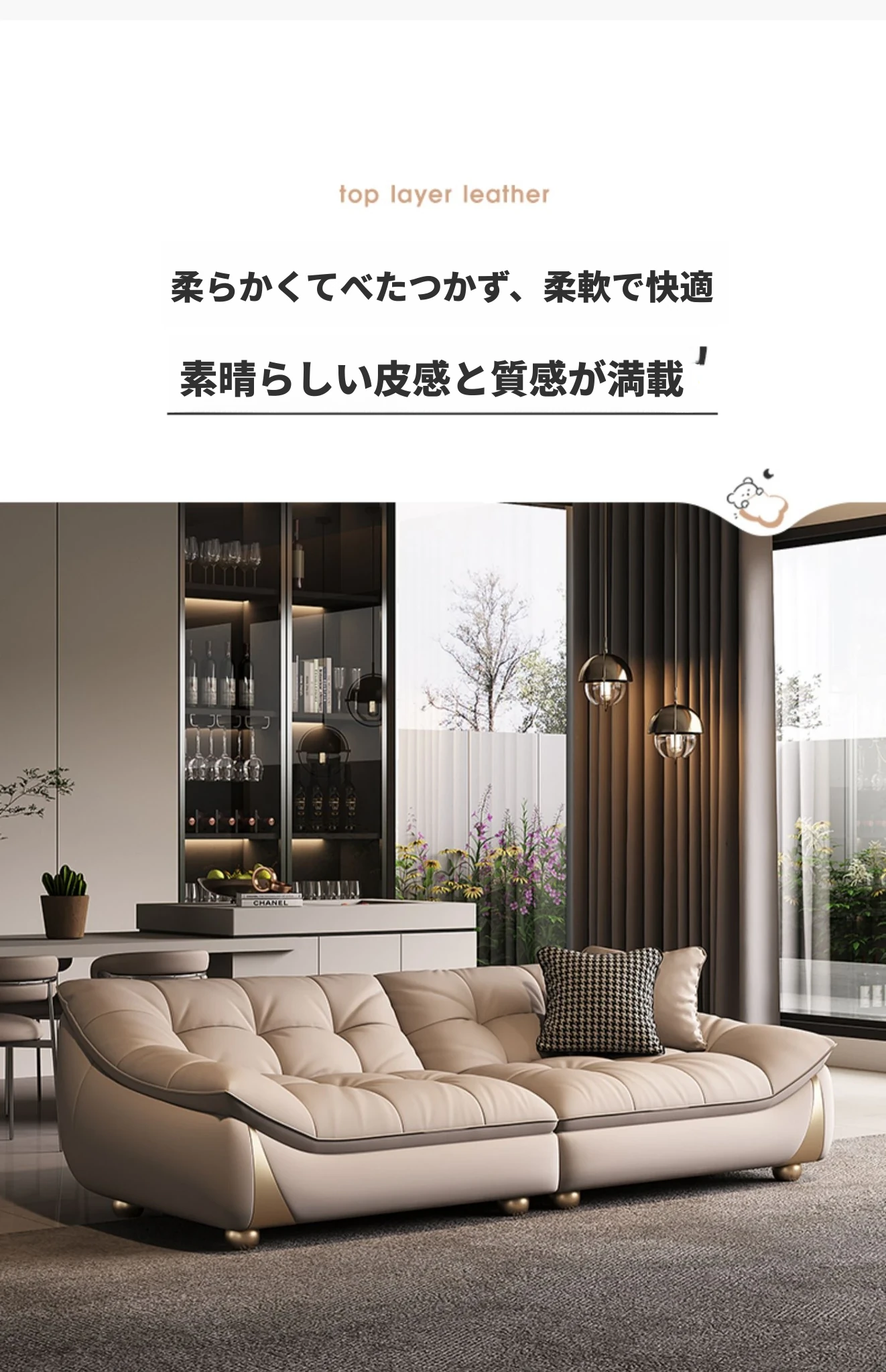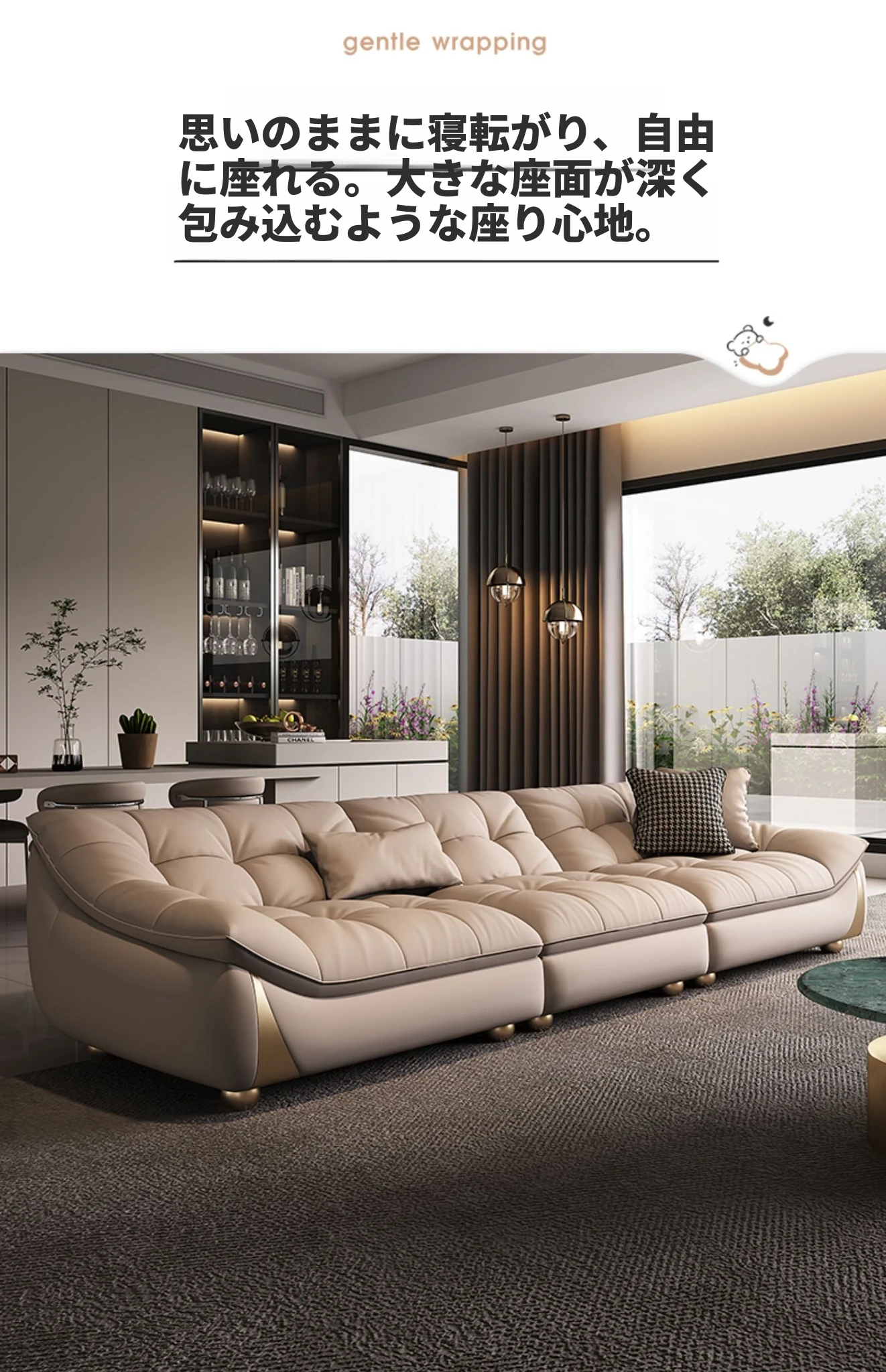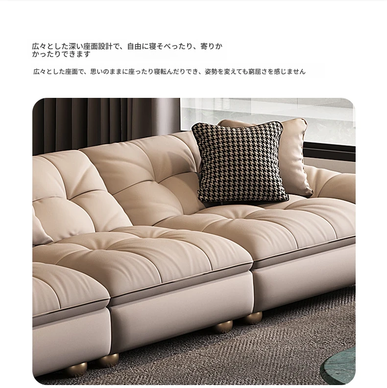 2024年最新モデル!現代的ラグジュアリーなクリーム風デザイン、真のレザーを使用したダウンセーリングソファ。横長リビングや別荘にぴったりのスタイリッシュなラグジュアリーアイテム!