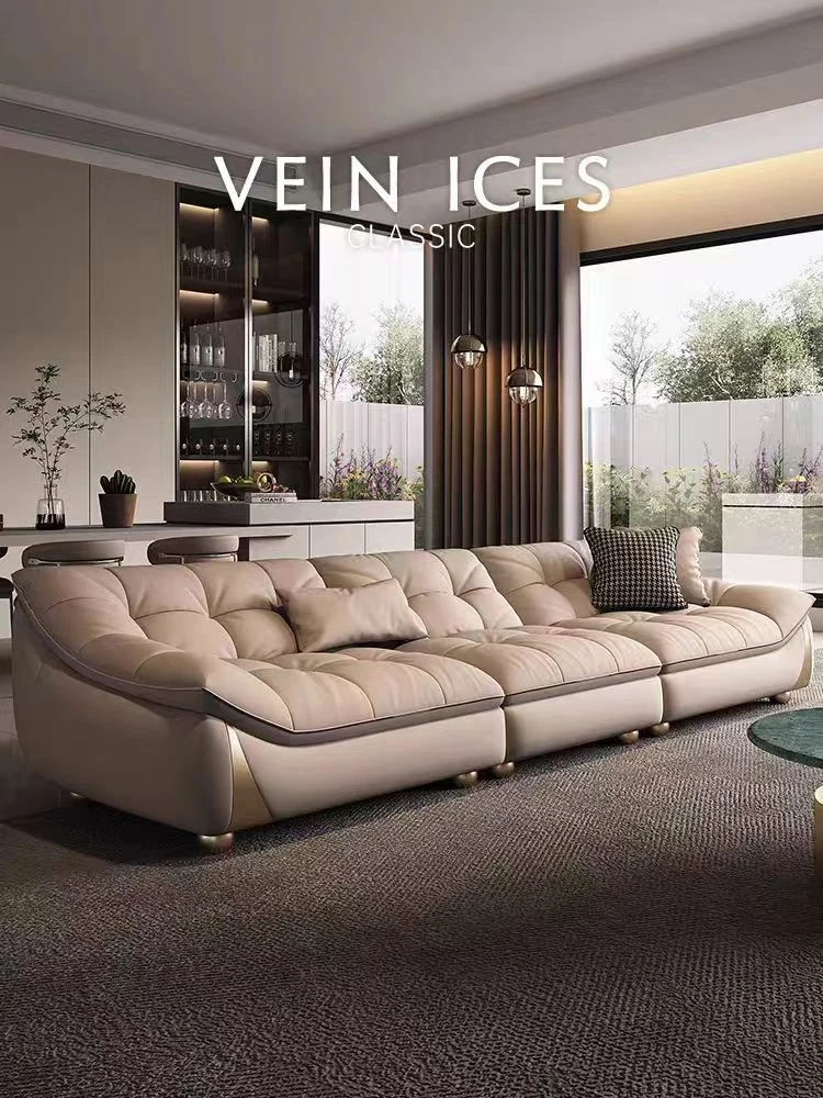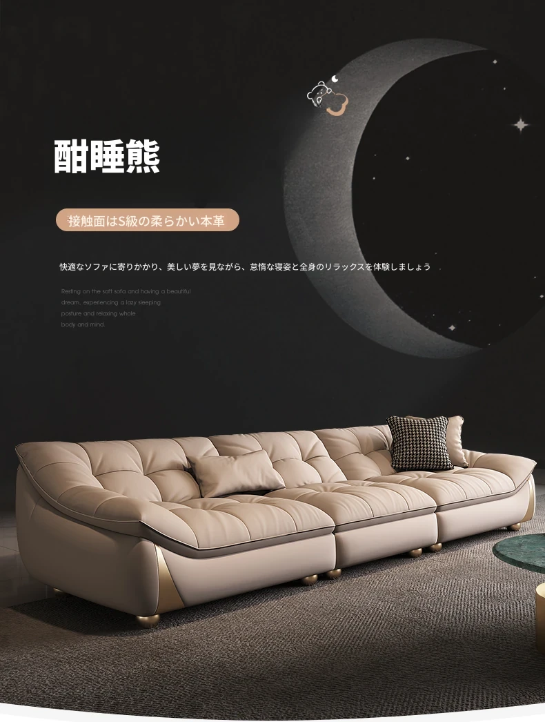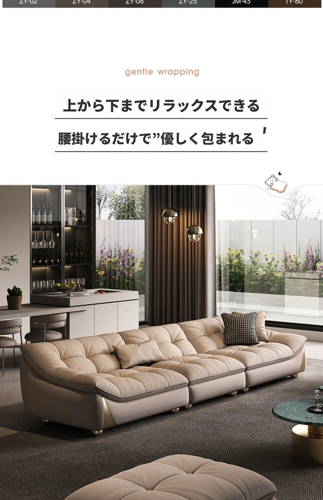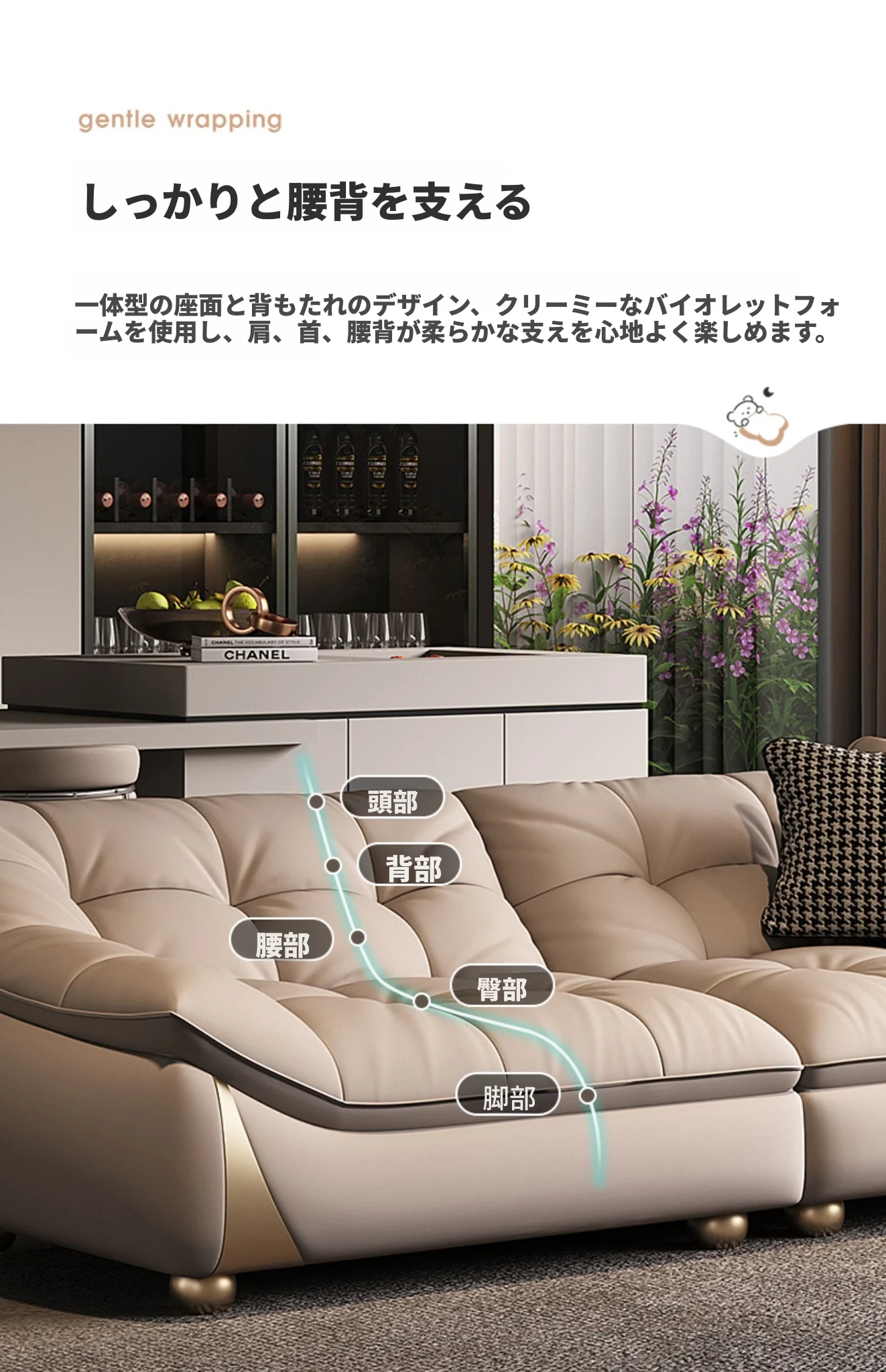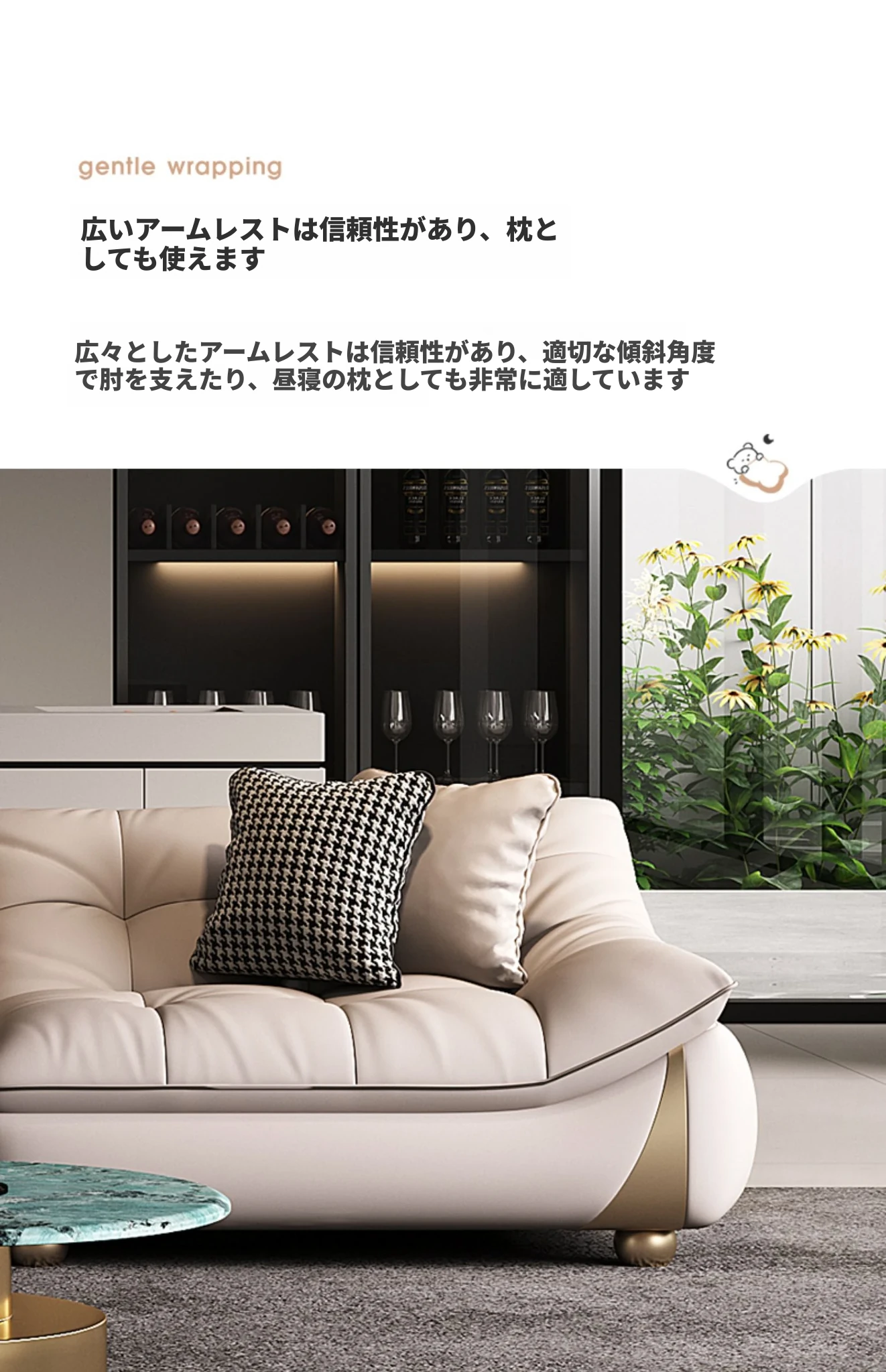 2024年最新モデル!現代的ラグジュアリーなクリーム風デザイン、真のレザーを使用したダウンセーリングソファ。横長リビングや別荘にぴったりのスタイリッシュなラグジュアリーアイテム!