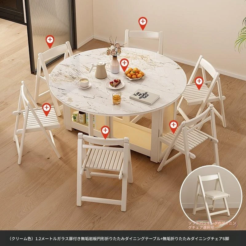 1.2メートルガラスドア実木岩板円形折りたたみダイニングテーブル+折りたたみ椅子*6