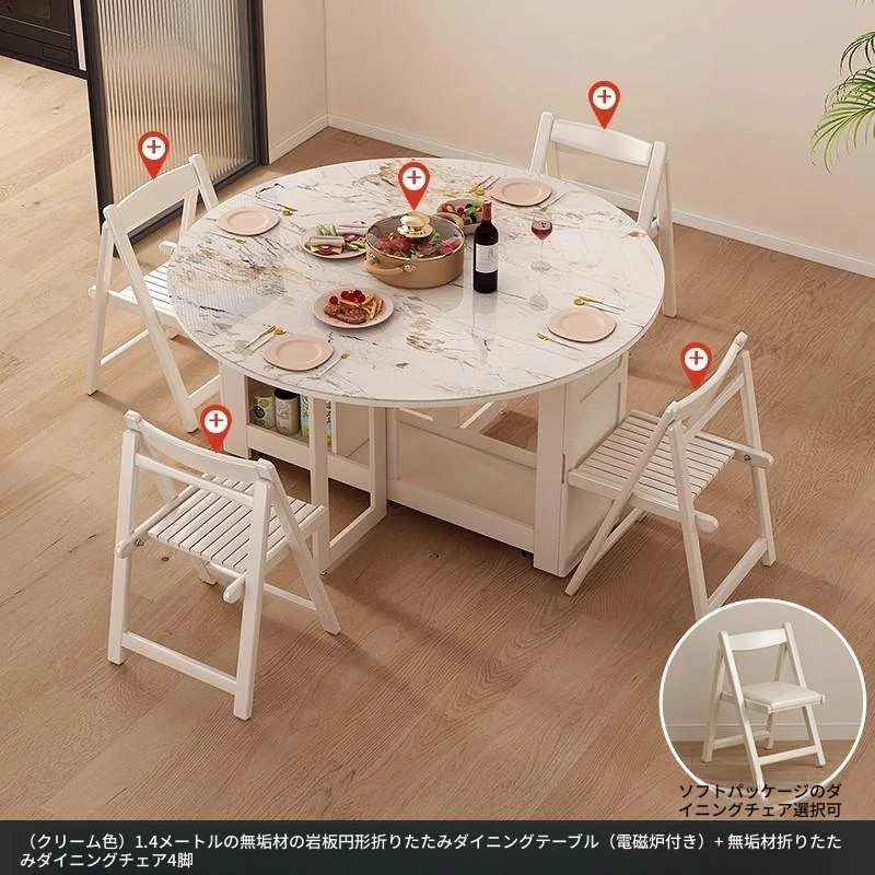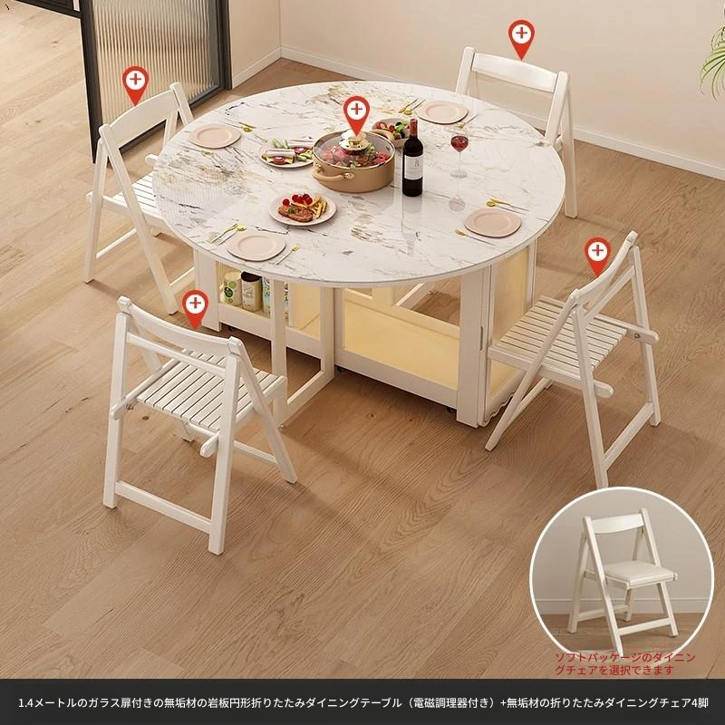 1.4メートルガラスドア実木岩板円形折りたたみダイニングテーブル+電磁炉+折りたたみ椅子*4