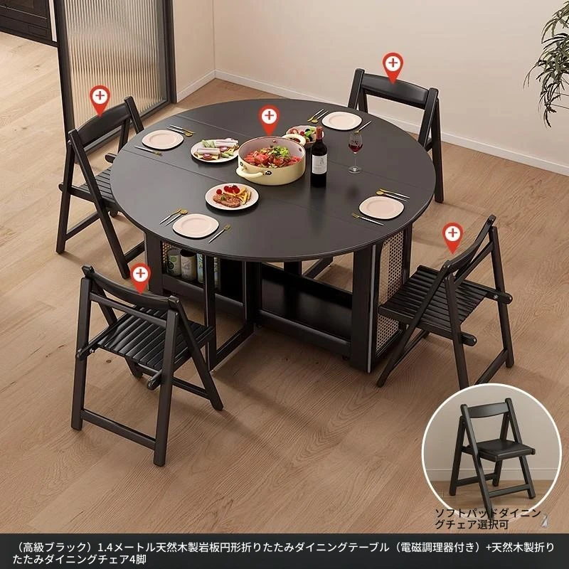 1.4メートル実木岩板円形折りたたみダイニングテーブル【六防抗菌高級黒】+電磁炉+折りたたみ椅子*4