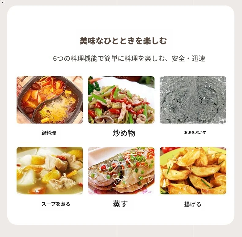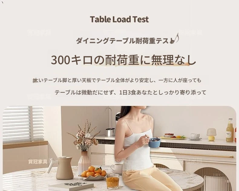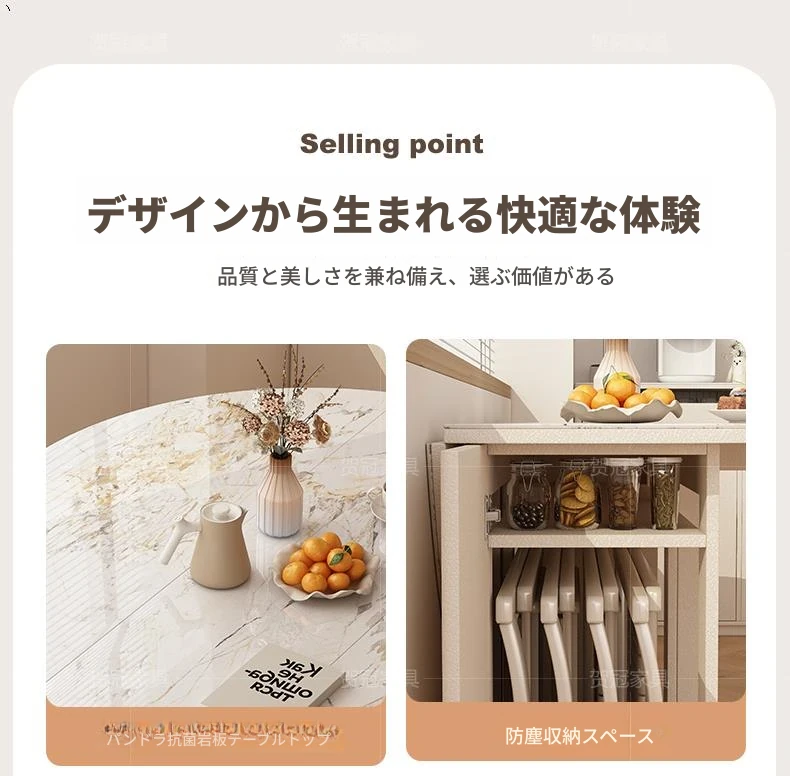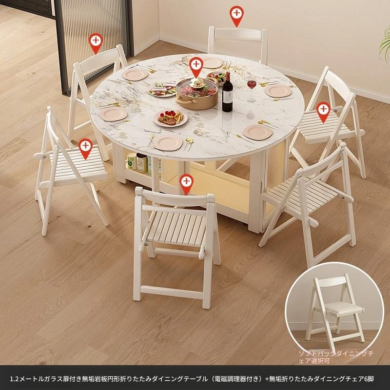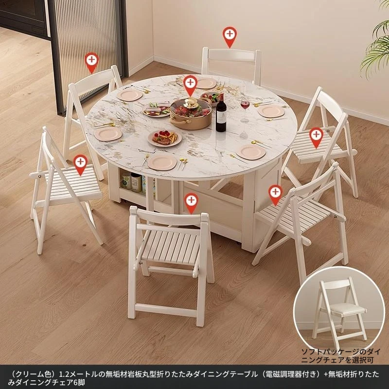1.2メートル実木岩板円形折りたたみダイニングテーブル【肌感皮纹クリーム色】+電磁炉+折りたたみ椅子*6