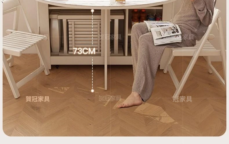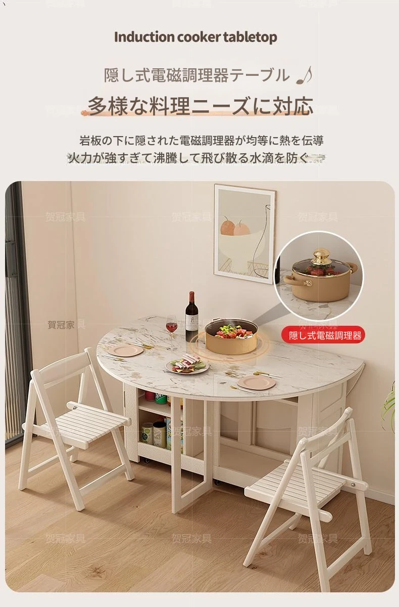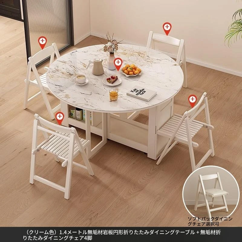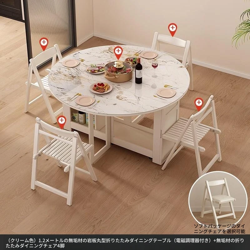1.2メートル実木岩板円形折りたたみダイニングテーブル【肌感皮纹クリーム色】+電磁炉+折りたたみ椅子*4