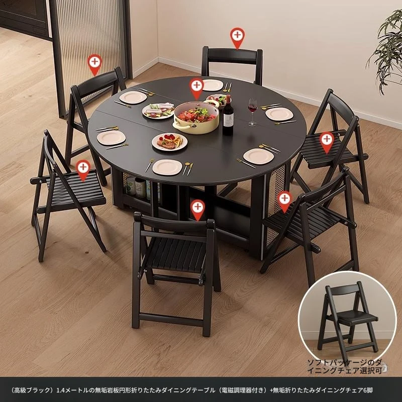 1.4メートル実木岩板円形折りたたみダイニングテーブル【六防抗菌高級黒】+電磁炉+折りたたみ椅子*6