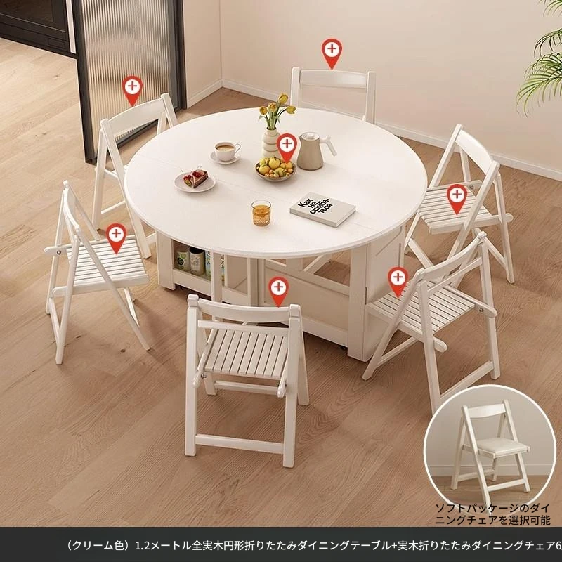 1.2メートル全実木円形折りたたみダイニングテーブル【肌感皮纹クリーム色】+折りたたみ椅子*6