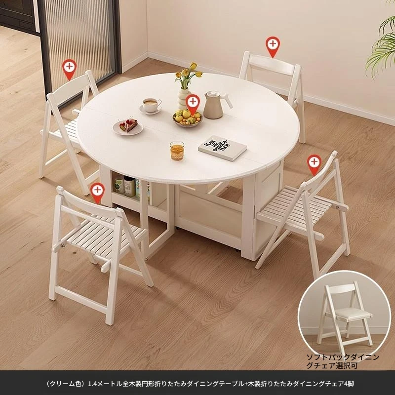 1.4メートル全実木円形折りたたみダイニングテーブル【肌感皮纹クリーム色】+折りたたみ椅子*4