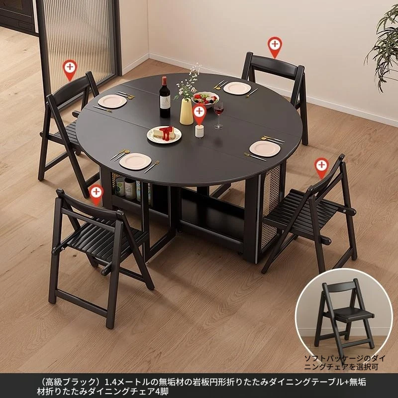 1.4メートル実木岩板円形折りたたみダイニングテーブル【六防抗菌高級黒】+折りたたみ椅子*4