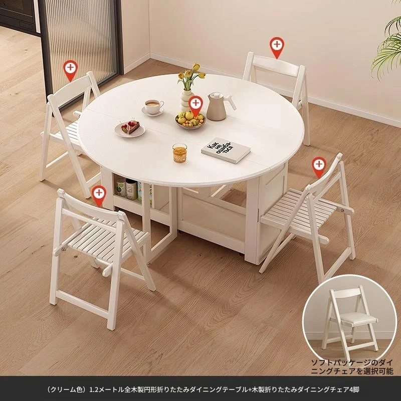 1.2メートル全実木円形折りたたみダイニングテーブル【肌感皮纹クリーム色】+折りたたみ椅子*4
