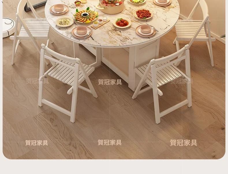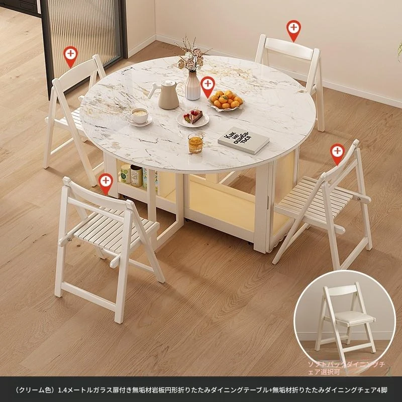 1.4メートルガラスドア実木岩板円形折りたたみダイニングテーブル+折りたたみ椅子*4