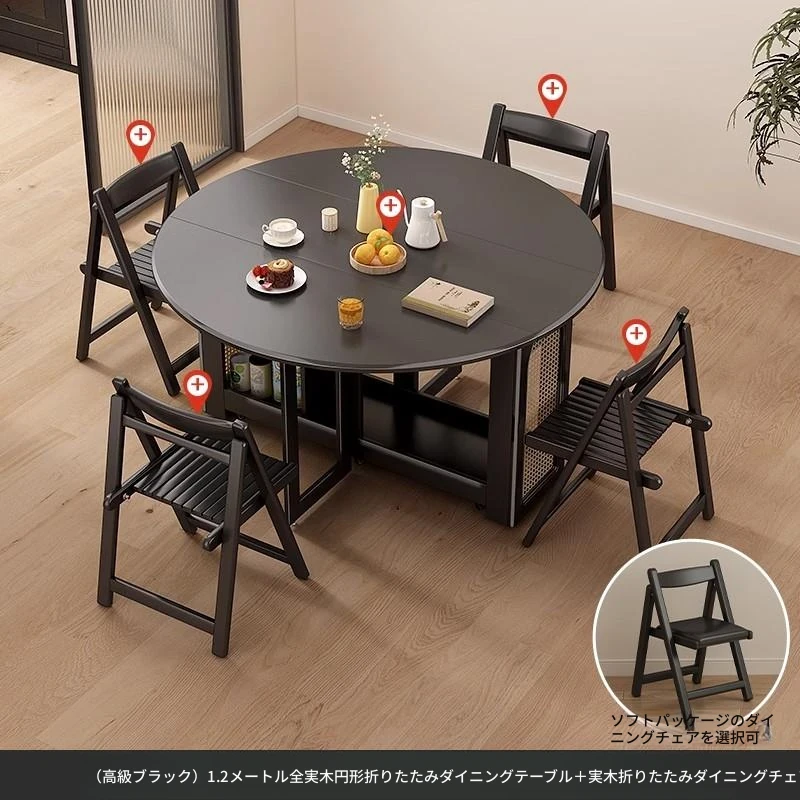 1.2メートル全実木円形折りたたみダイニングテーブル【六防抗菌高級黒】+折りたたみ椅子*4
