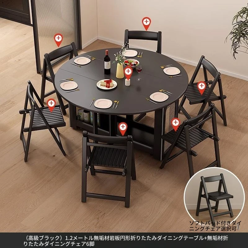 1.2メートル実木岩板円形折りたたみダイニングテーブル【六防抗菌高級黒】+折りたたみ椅子*6