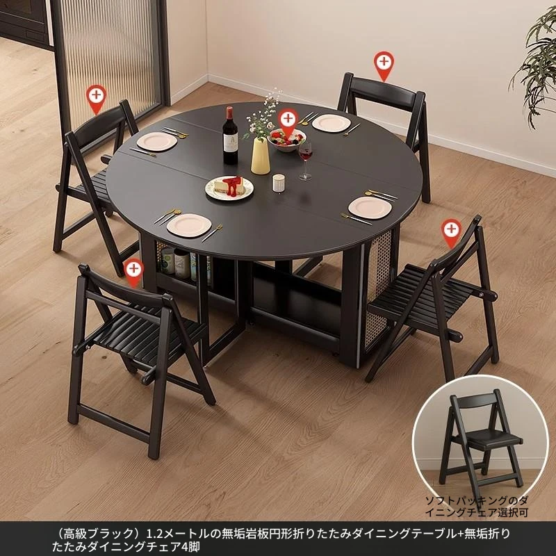 1.2メートル実木岩板円形折りたたみダイニングテーブル【六防抗菌高級黒】+電磁炉+折りたたみ椅子*4