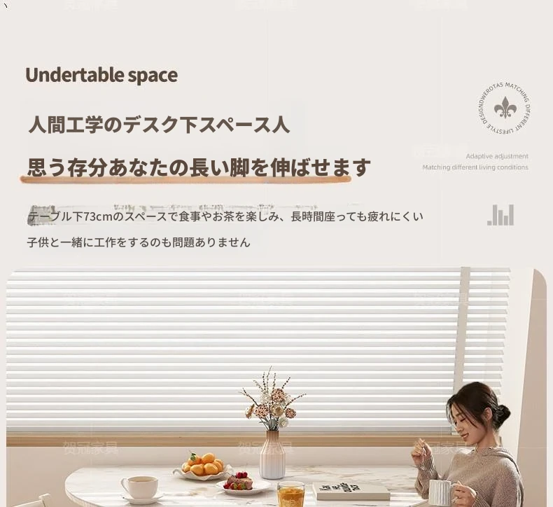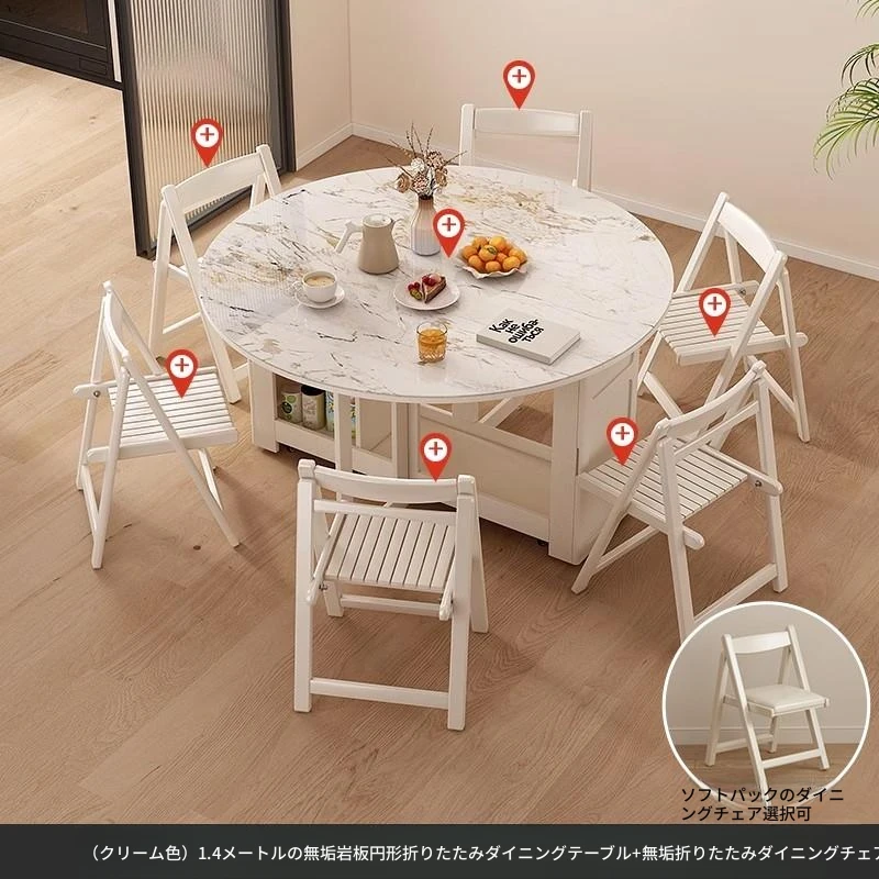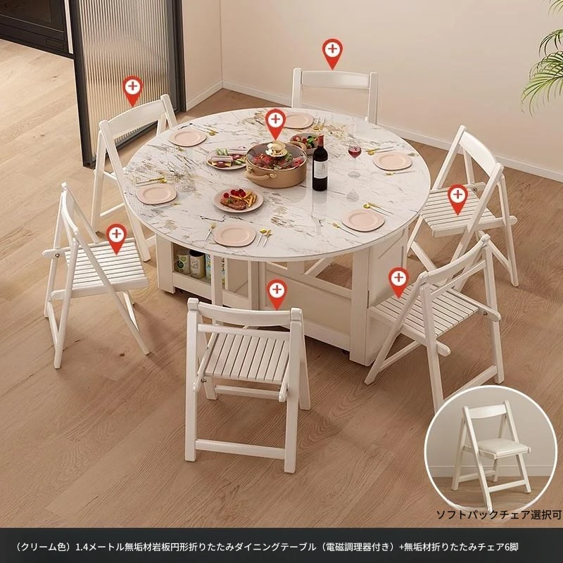 1.4メートル実木岩板円形折りたたみダイニングテーブル【肌感皮纹クリーム色】+電磁炉+折りたたみ椅子*6