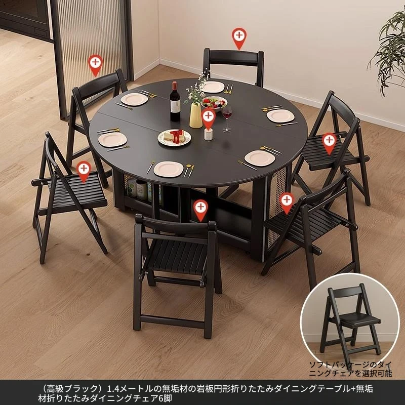 1.4メートル実木岩板円形折りたたみダイニングテーブル【六防抗菌高級黒】+折りたたみ椅子*6
