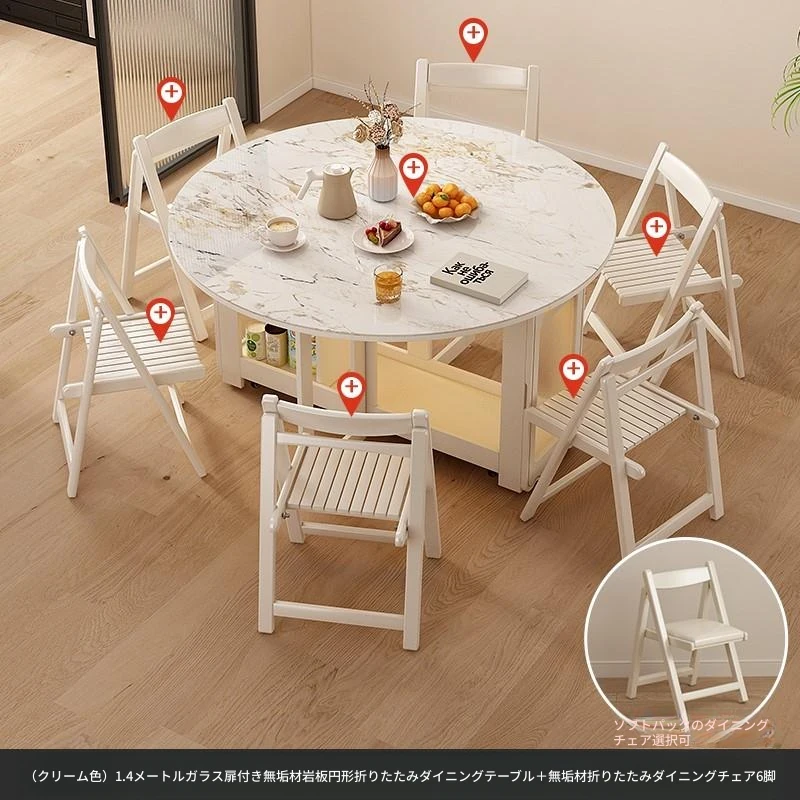1.4メートルガラスドア実木岩板円形折りたたみダイニングテーブル+折りたたみ椅子*6