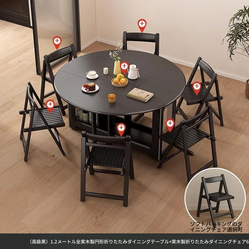 1.2メートル全実木円形折りたたみダイニングテーブル【六防抗菌高級黒】+折りたたみ椅子*6