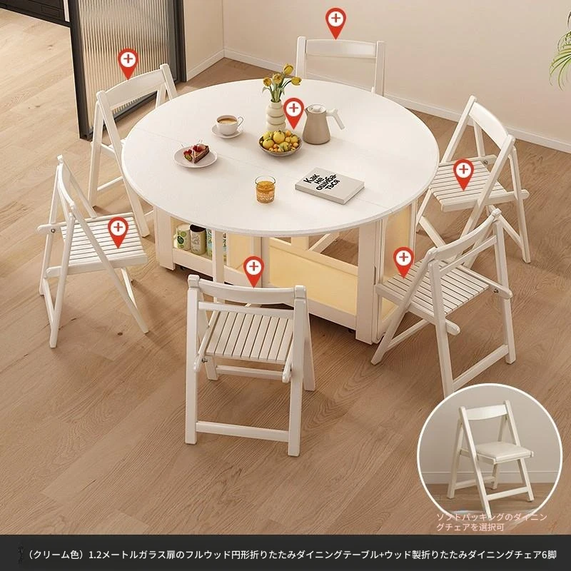 1.2メートルガラスドア全実木円形折りたたみダイニングテーブル+折りたたみ椅子*6