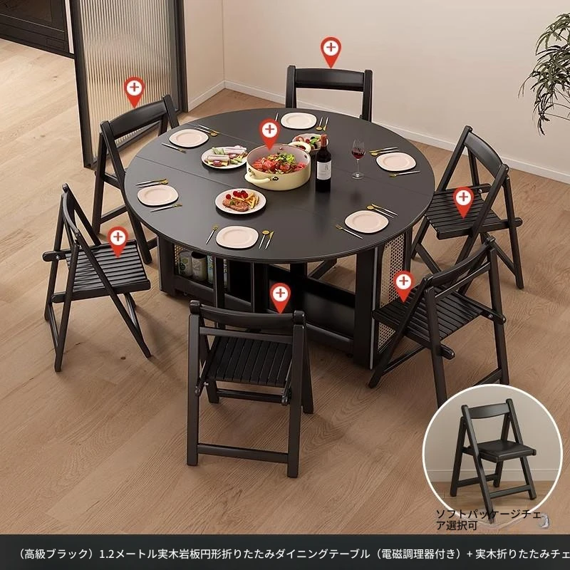 1.2メートル実木岩板円形折りたたみダイニングテーブル【六防抗菌高級黒】+電磁炉+折りたたみ椅子*6