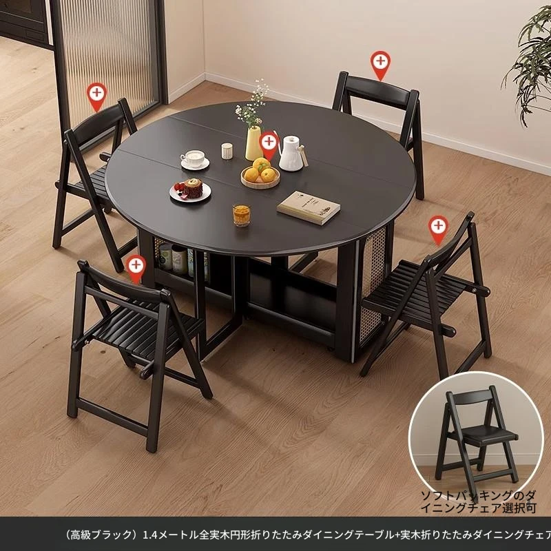 1.4メートル全実木円形折りたたみダイニングテーブル【六防抗菌高級黒】+折りたたみ椅子*4