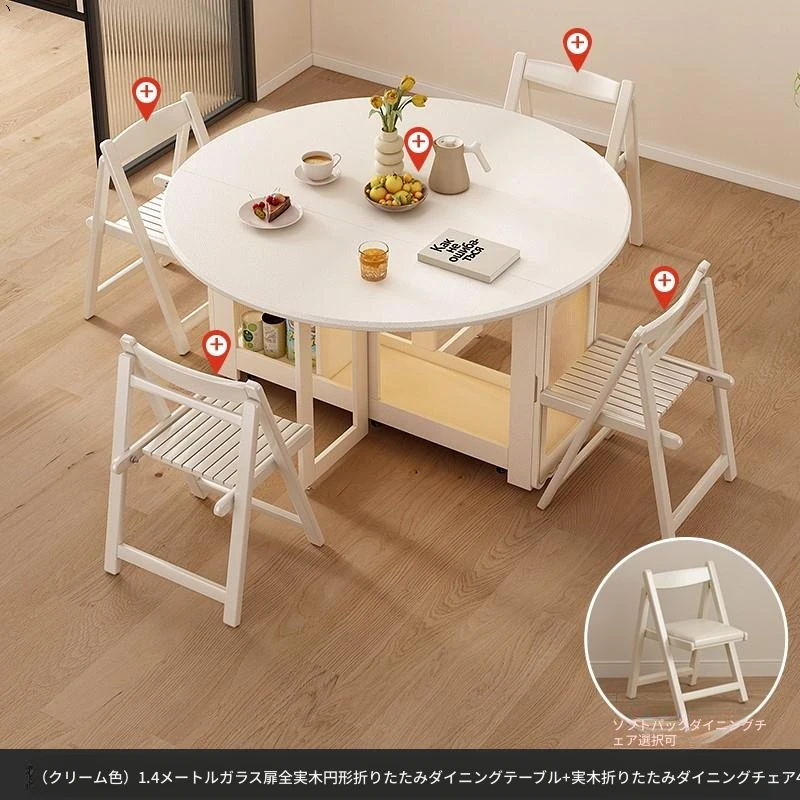 1.4メートルガラスドア全実木円形折りたたみダイニングテーブル+折りたたみ椅子*4