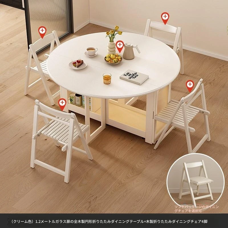 1.2メートルガラスドア全実木円形折りたたみダイニングテーブル+折りたたみ椅子*4