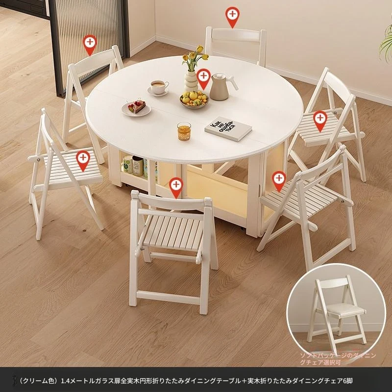 1.4メートルガラスドア全実木円形折りたたみダイニングテーブル+折りたたみ椅子*6