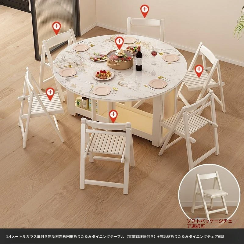 1.4メートルガラスドア実木岩板円形折りたたみダイニングテーブル+電磁炉+折りたたみ椅子*6