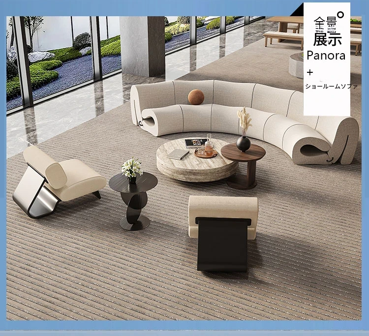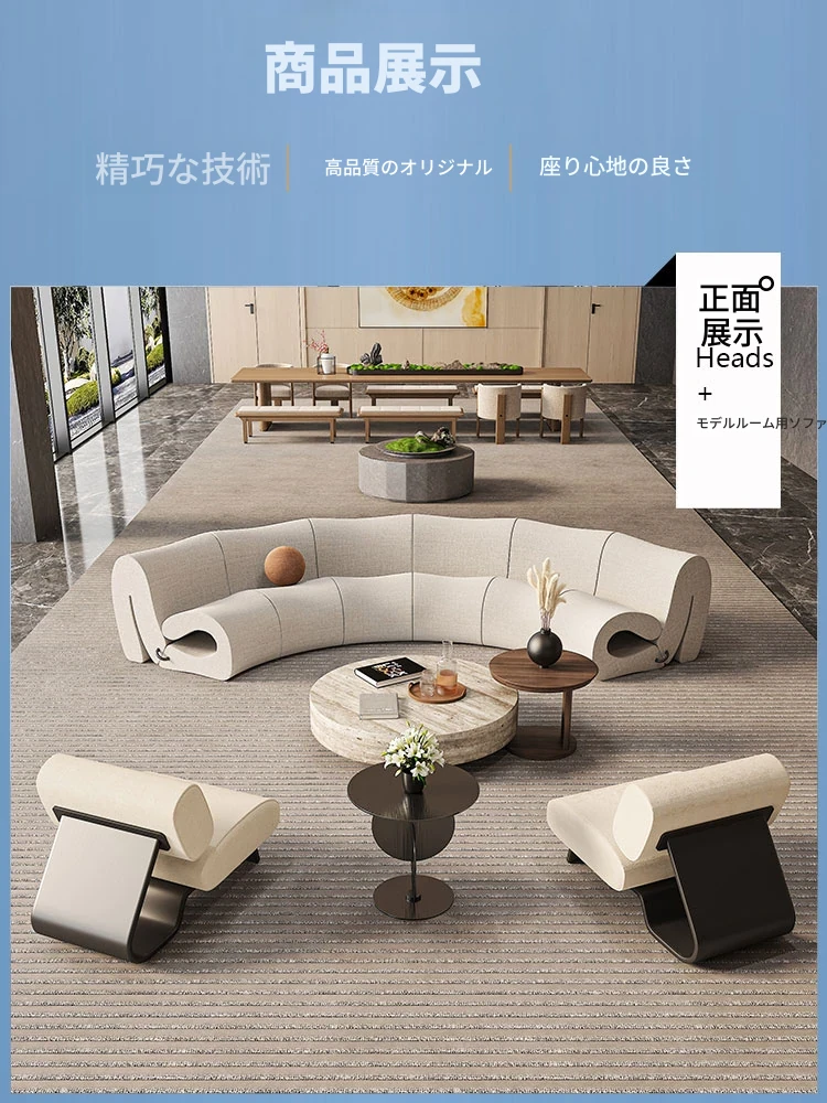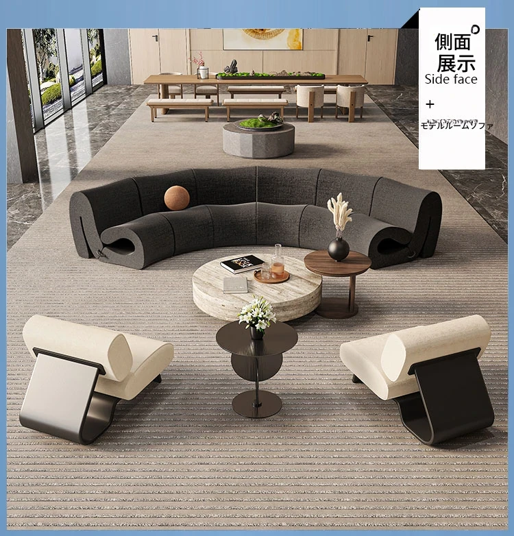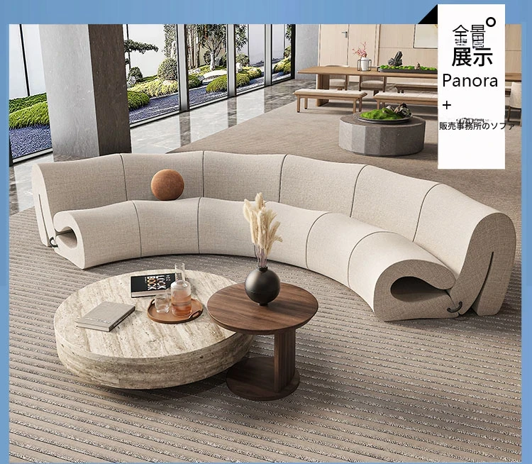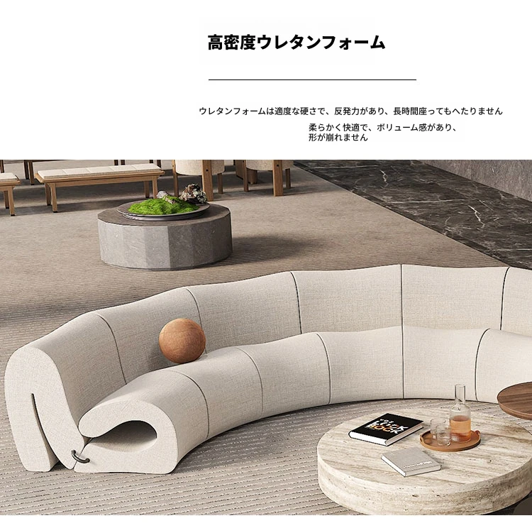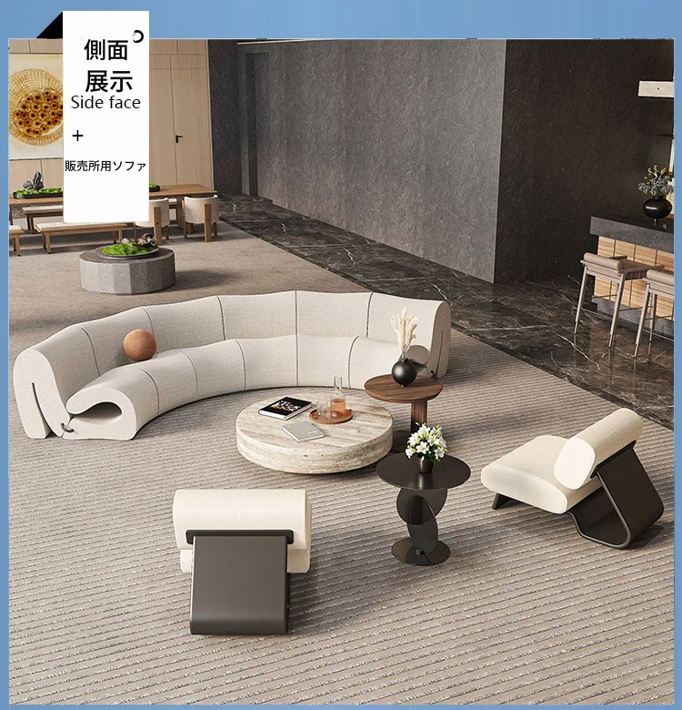 ホテルロビー用波紋デザインソファ|ユニークな形状で、民宿や美容院、医療美容クリニックの受付にも最適!優雅で快適な空間を演出する布製アーチ型ソファ。