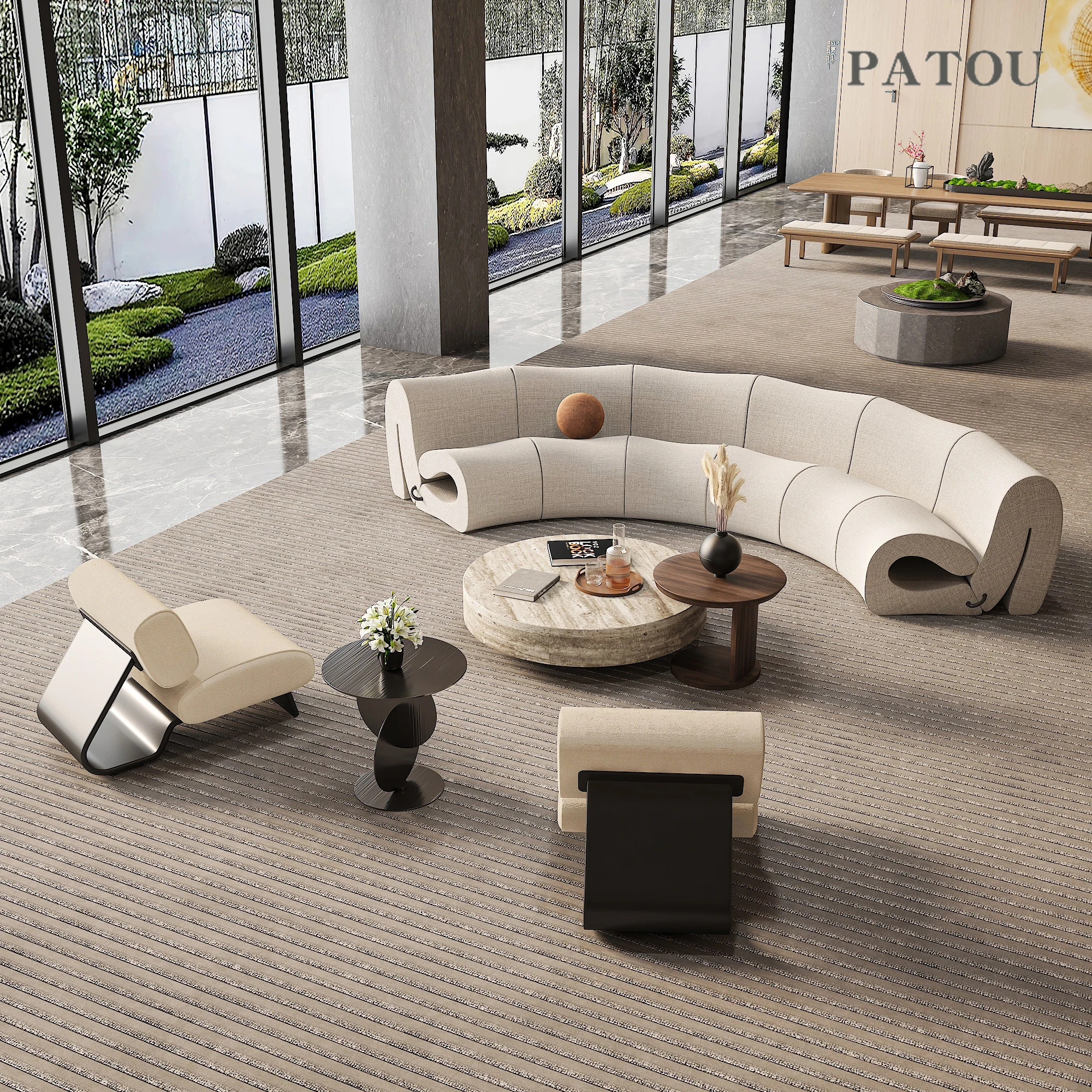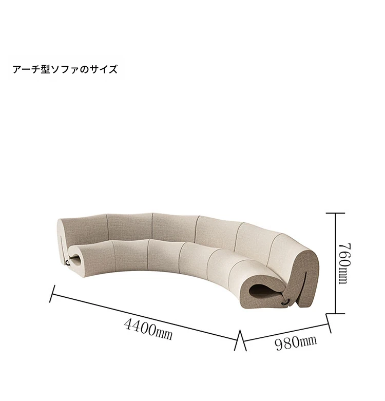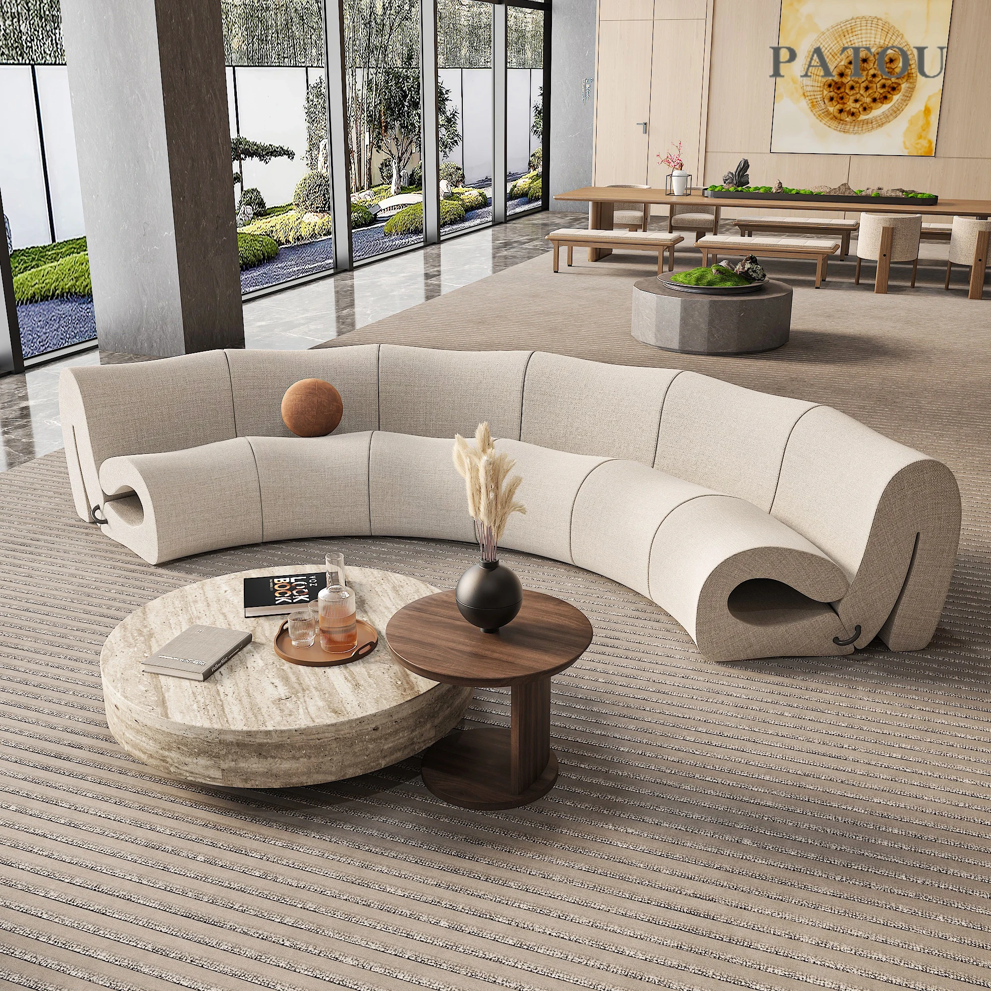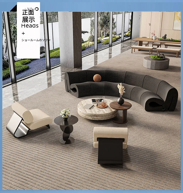 ホテルロビー用波紋デザインソファ|ユニークな形状で、民宿や美容院、医療美容クリニックの受付にも最適!優雅で快適な空間を演出する布製アーチ型ソファ。