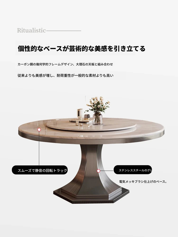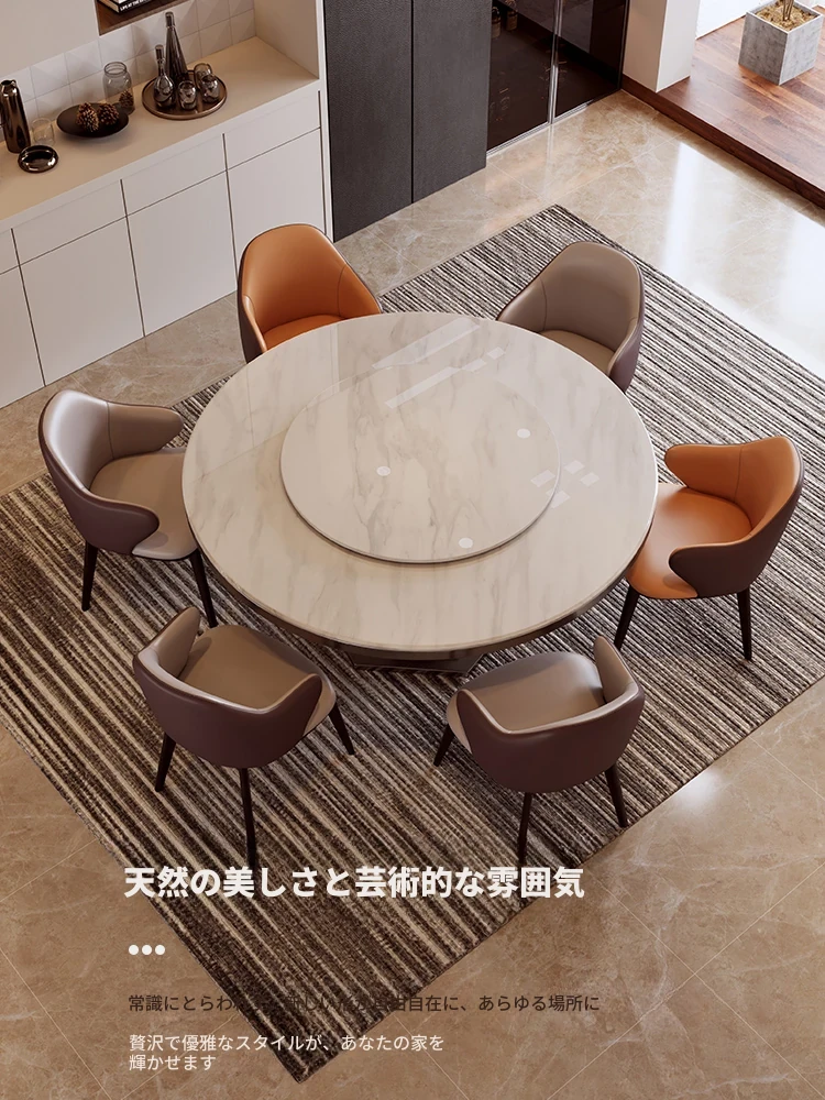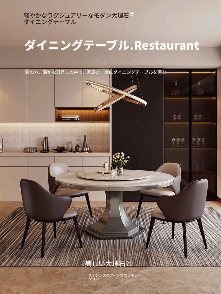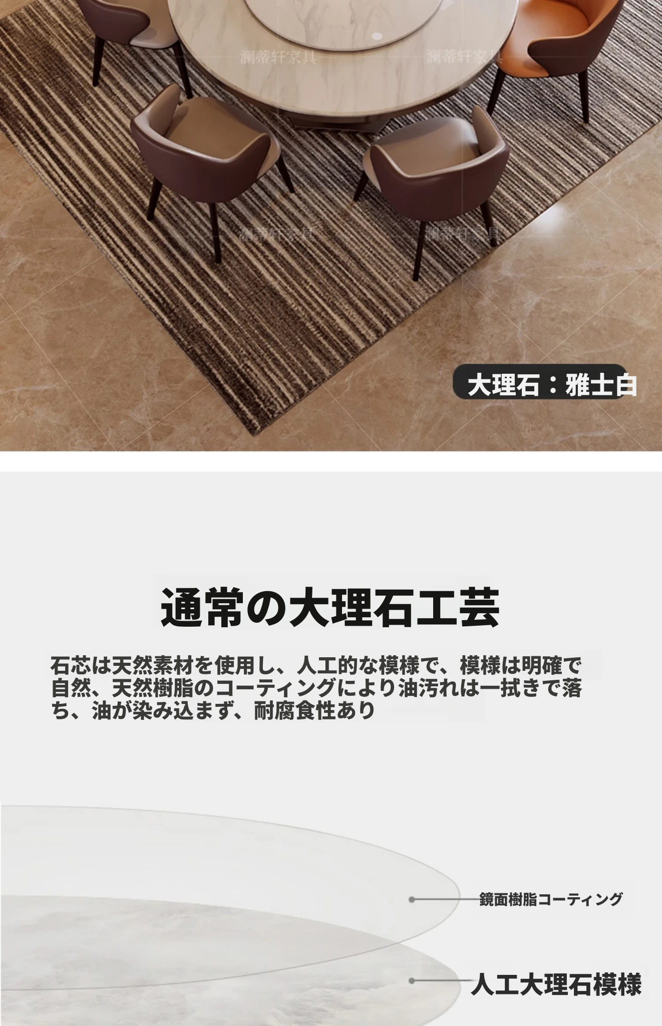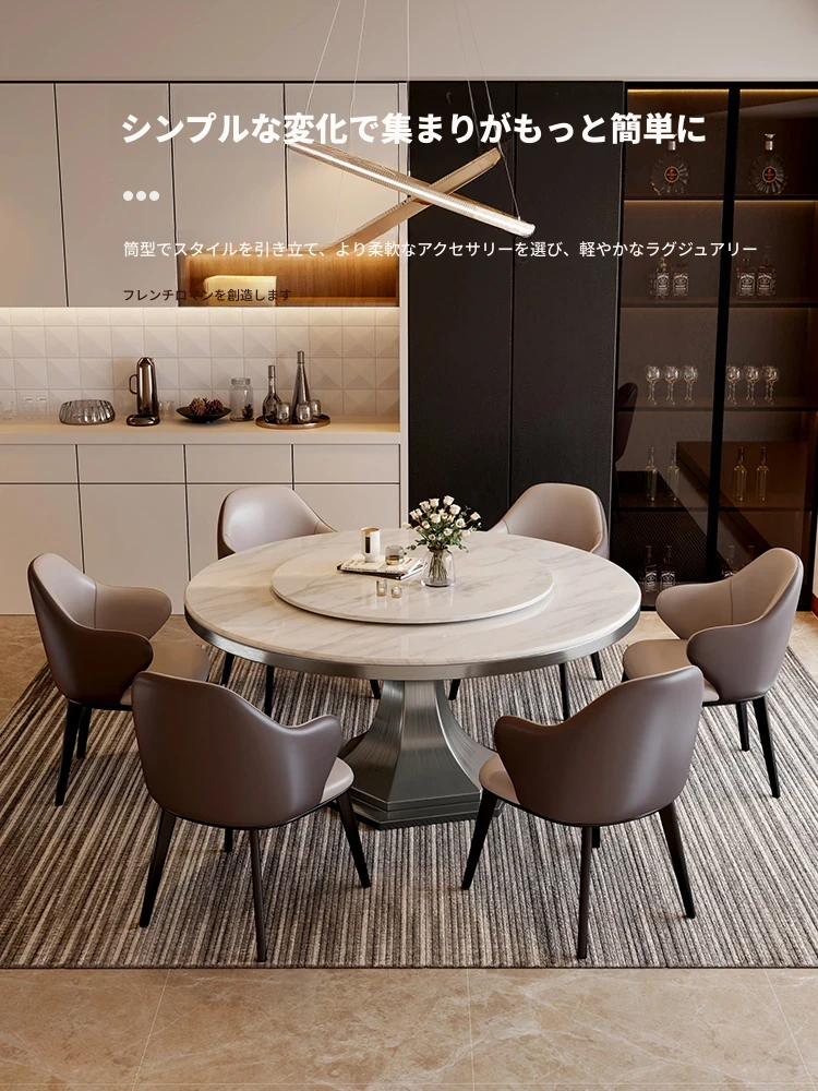 高級現代シンプルデザインの円形大理石ダイニングテーブルセット - 回転プレート付き、イタリアンラグジュアリーな雰囲気を演出する家用ダイニングテーブルとチェアの組み合わせ!