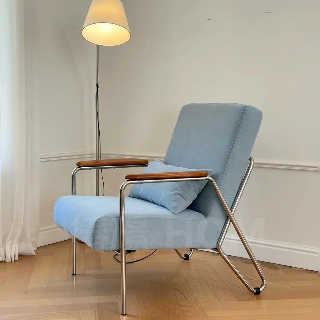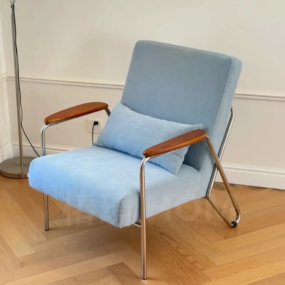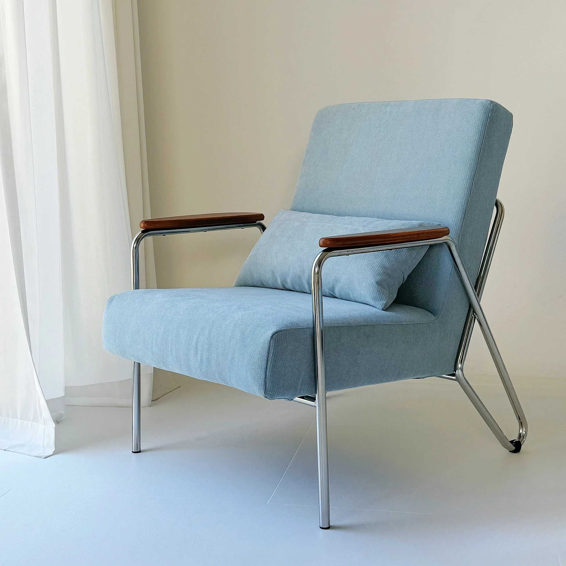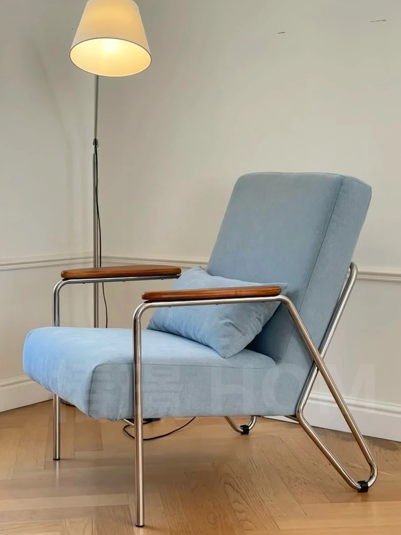 氷河ブルーの一人掛けソファー - 中古風のバウハウスアートデザイン、ヴァシリー鋼管スタイルのドーパミン効果を持つ一人用アームチェア!あなたの空間に洗練された美を加え、心地よさを提供します。