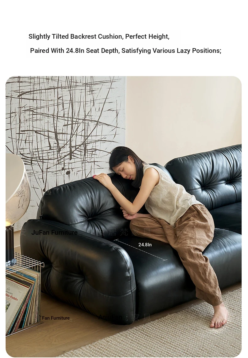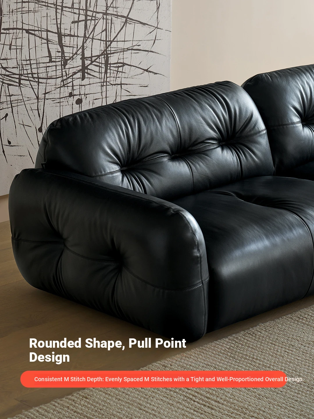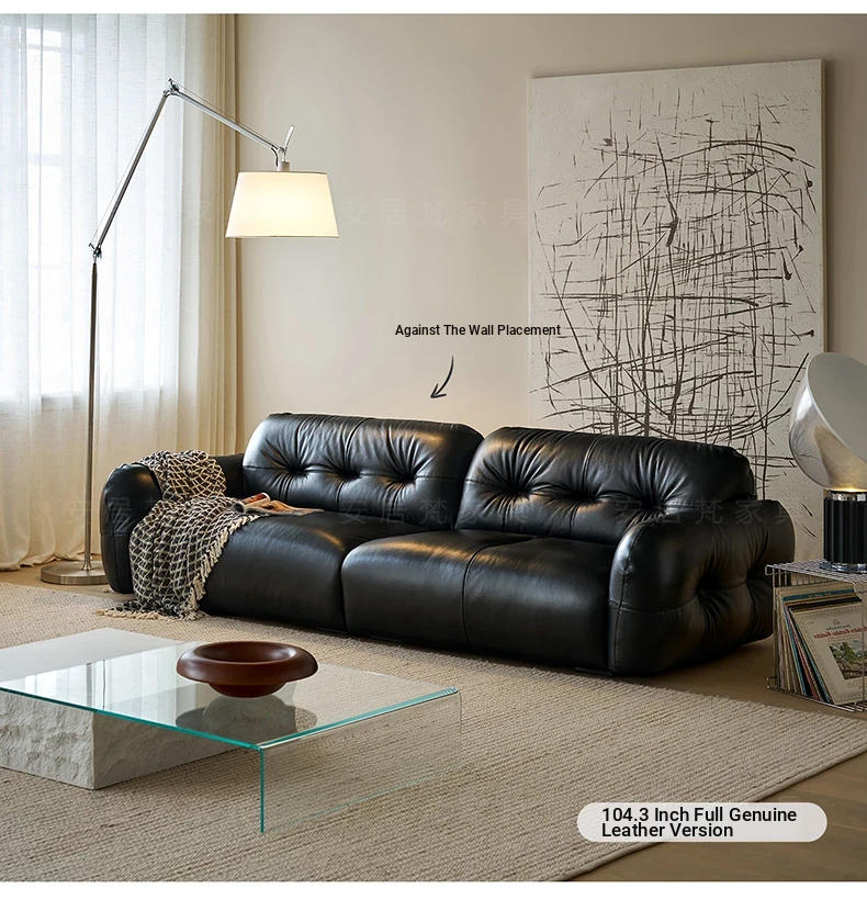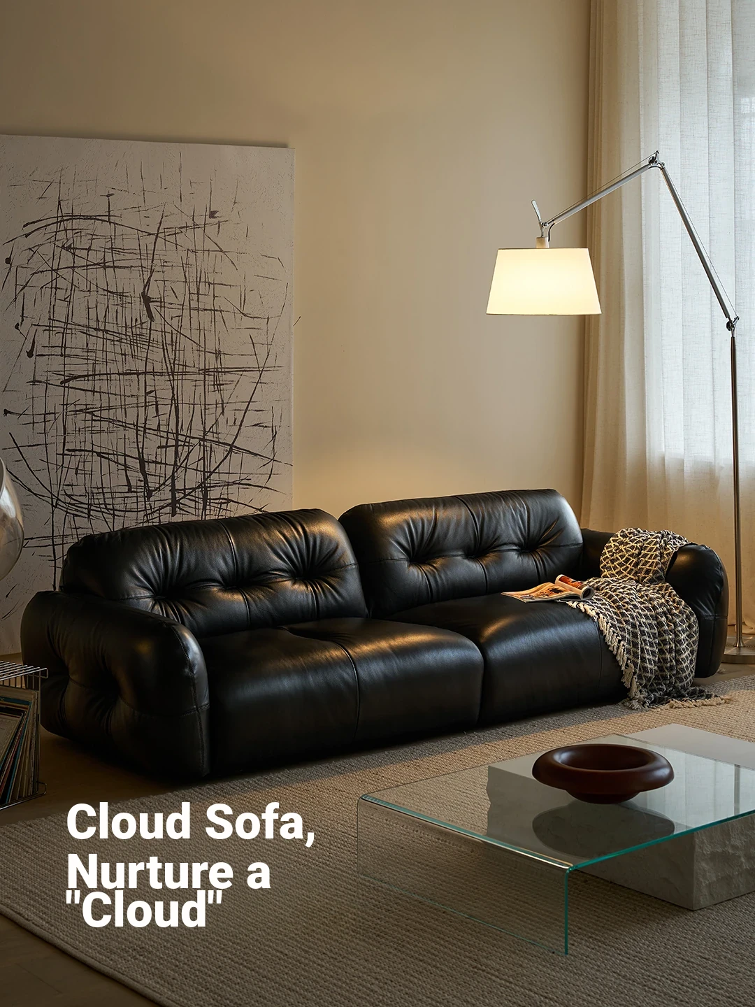 Italian Minimalist Genuine Leather Sofa - Modern Retro Style Black Cloud-Shape Sofa for Small Living Rooms