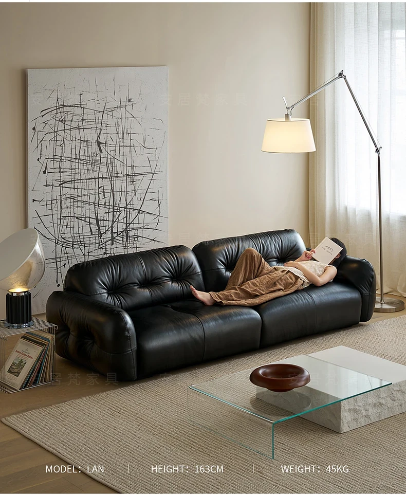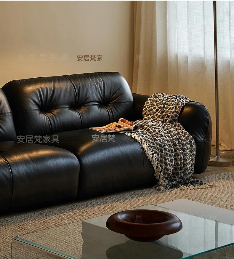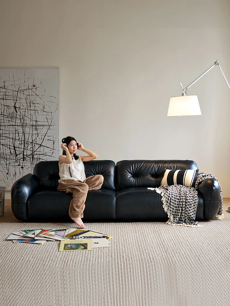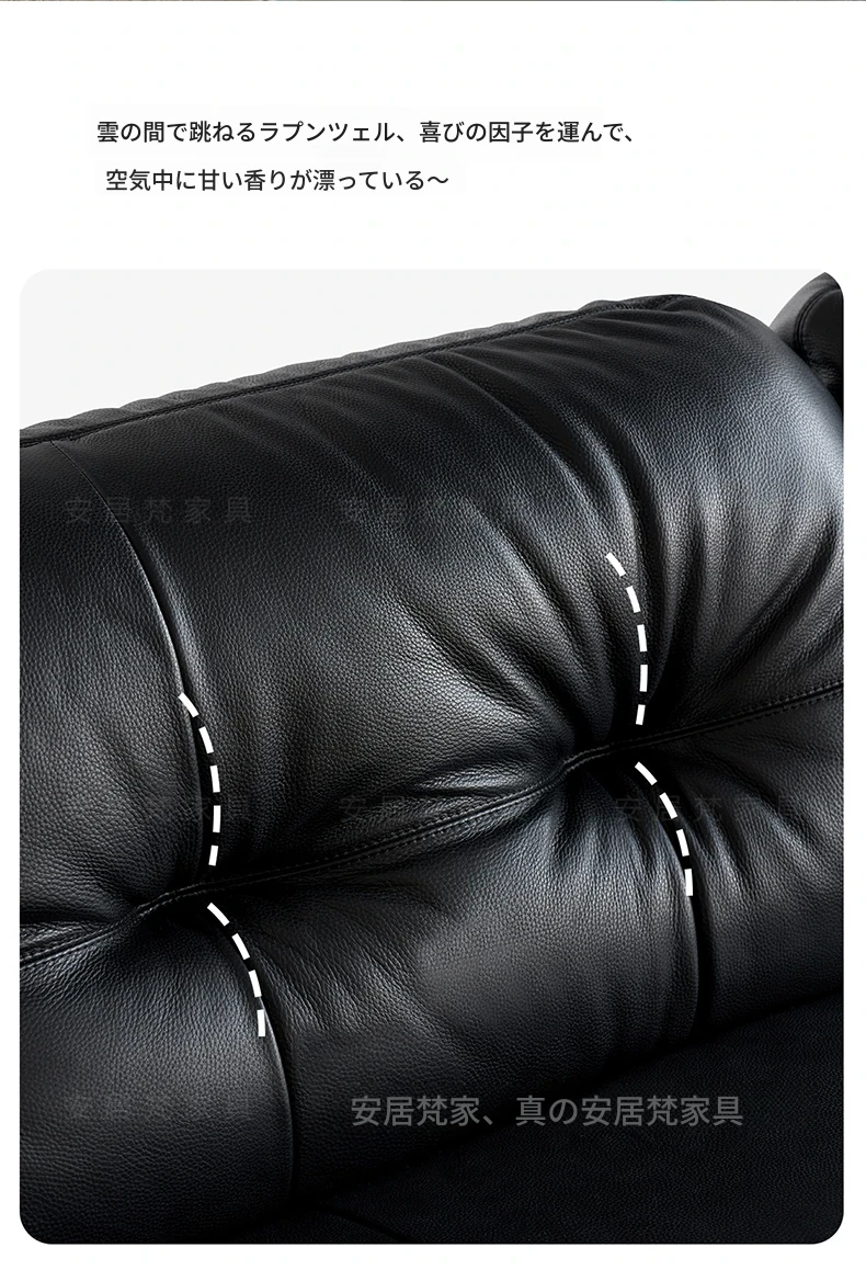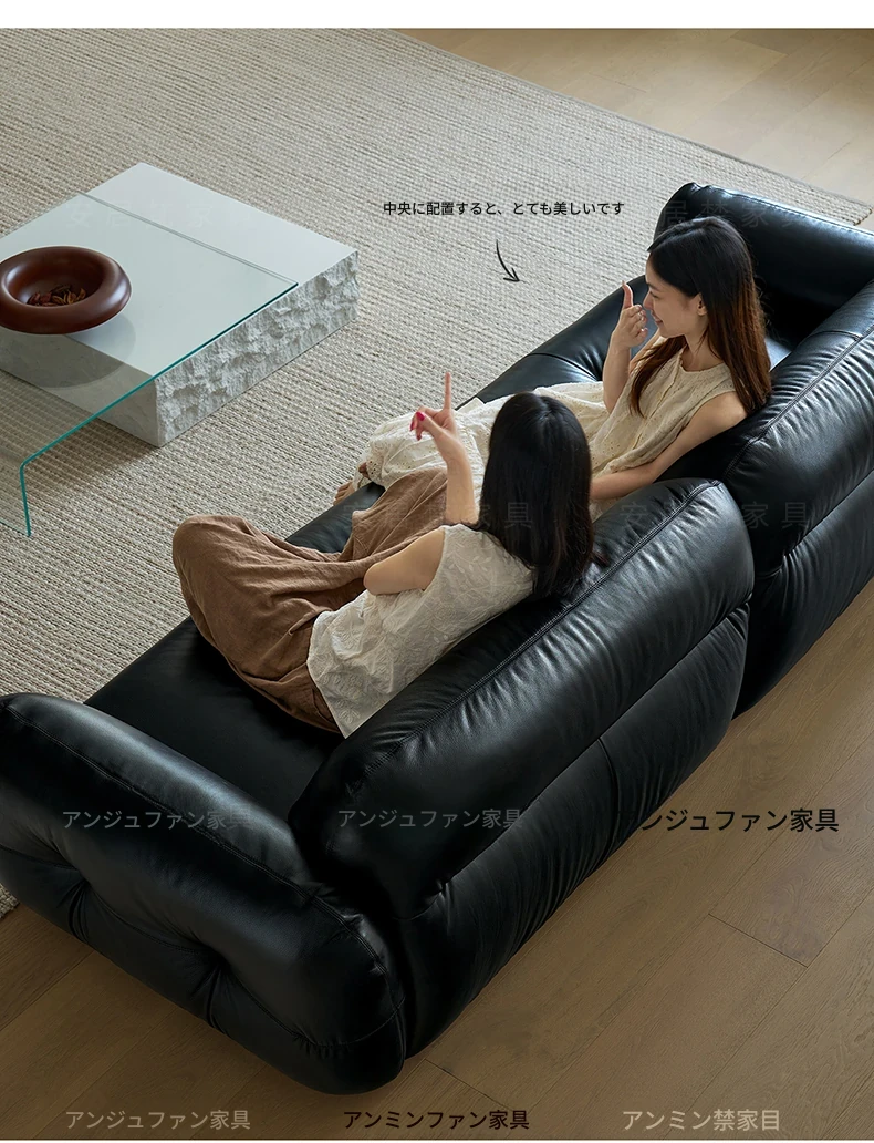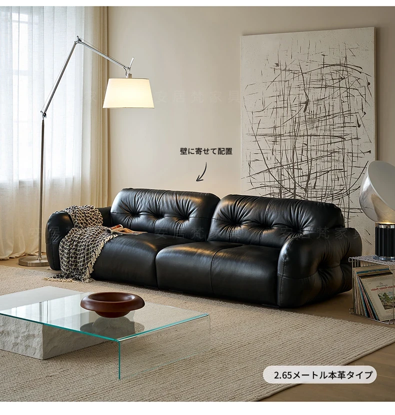 イタリアンミニマルデザイン本革ソファ|現代的でシンプルなレトロスタイルのブラック|小さなリビングにぴったりな直線的クラウドソファ