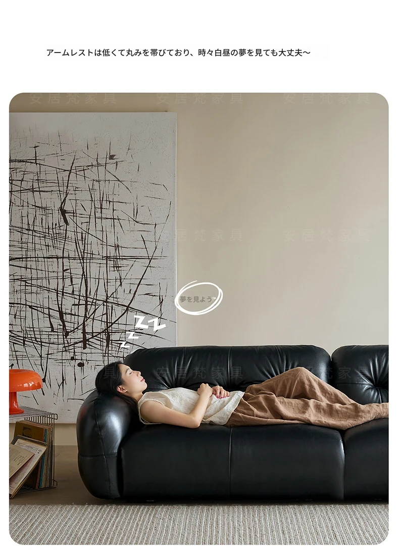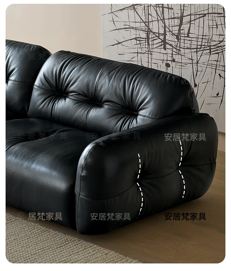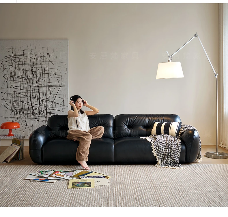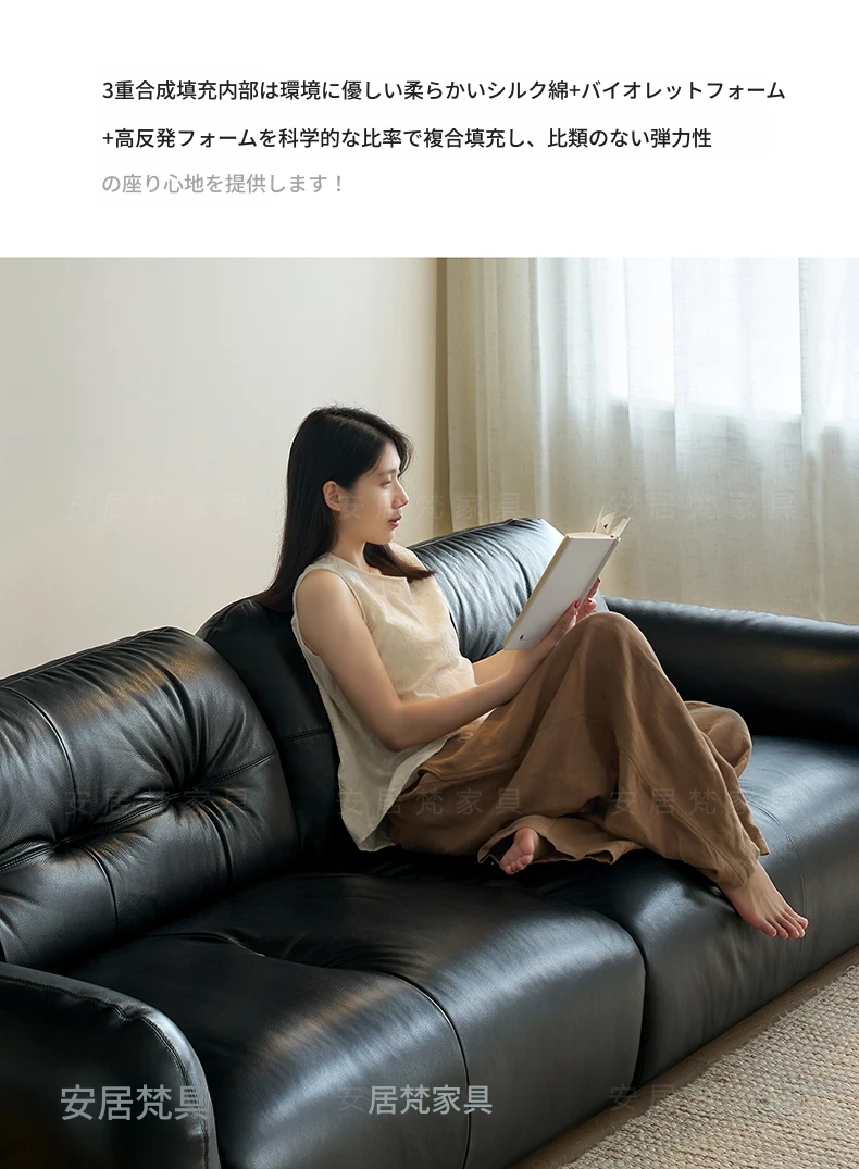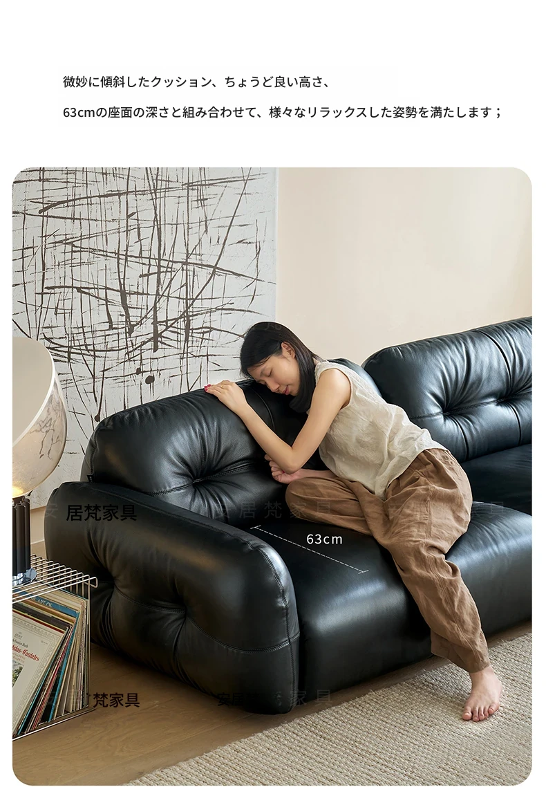 イタリアンミニマルデザイン本革ソファ|現代的でシンプルなレトロスタイルのブラック|小さなリビングにぴったりな直線的クラウドソファ