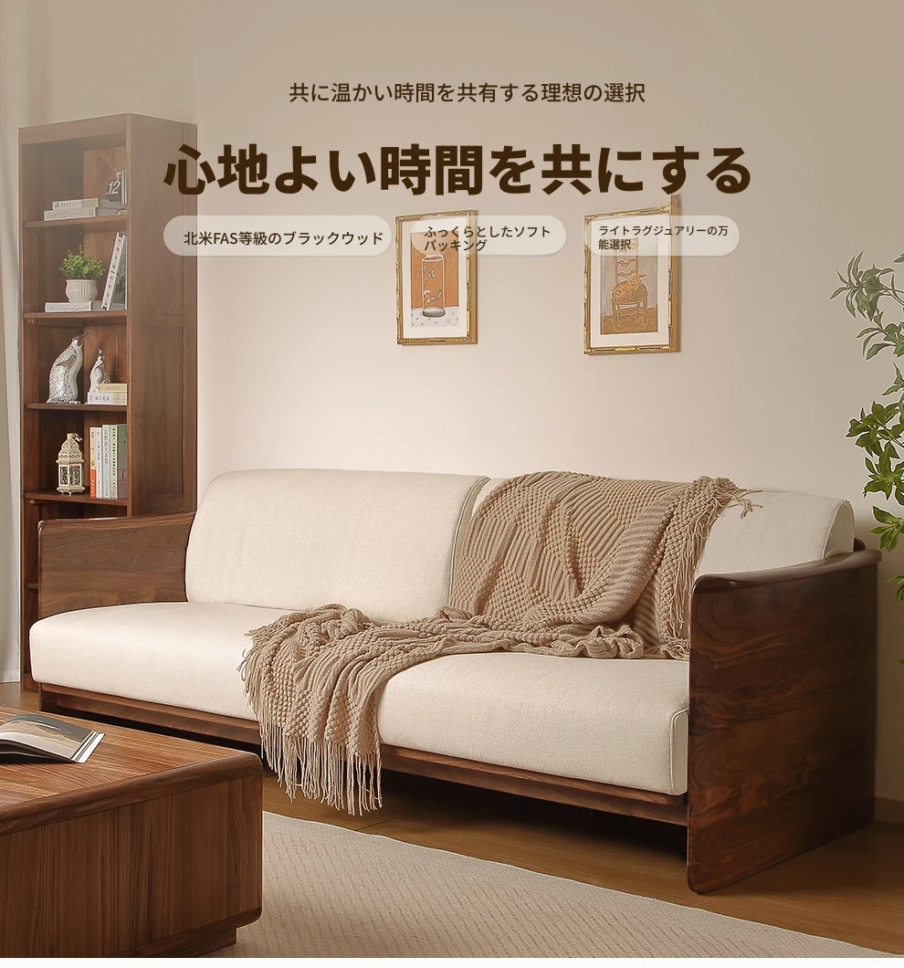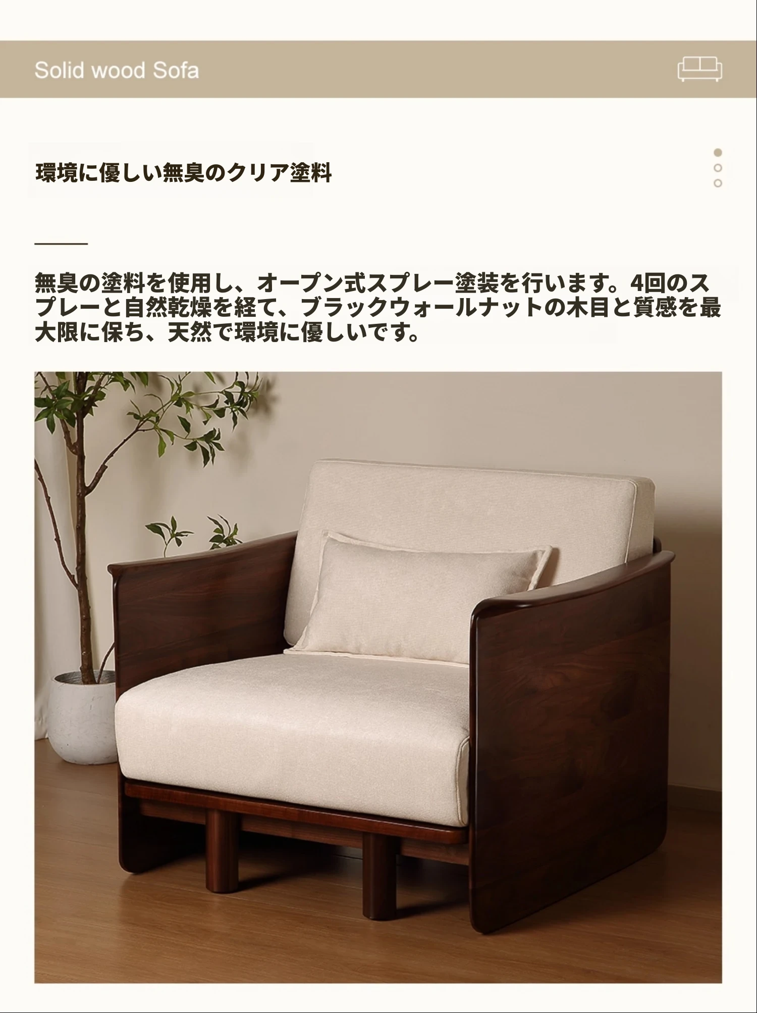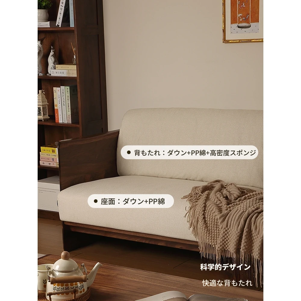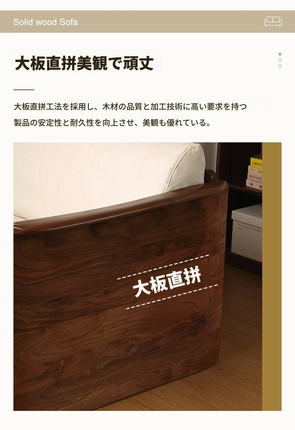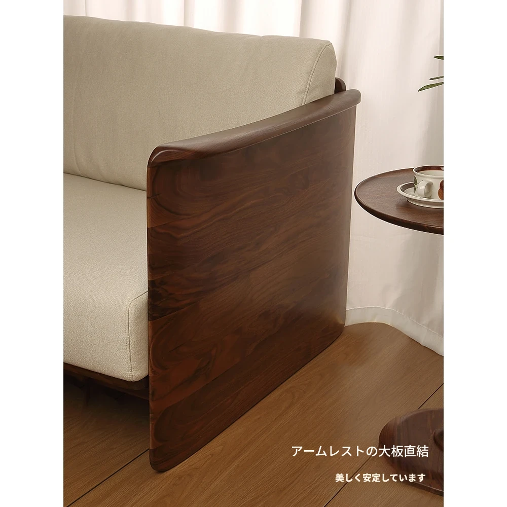 北米産ブラックウォールナットのシンプルなリビングソファ - 天然木の風合いを活かしたモダンデザイン、全実木構造で耐久性抜群!布地の柔らかさが心地よい、スタイリッシュな空間を演出します。