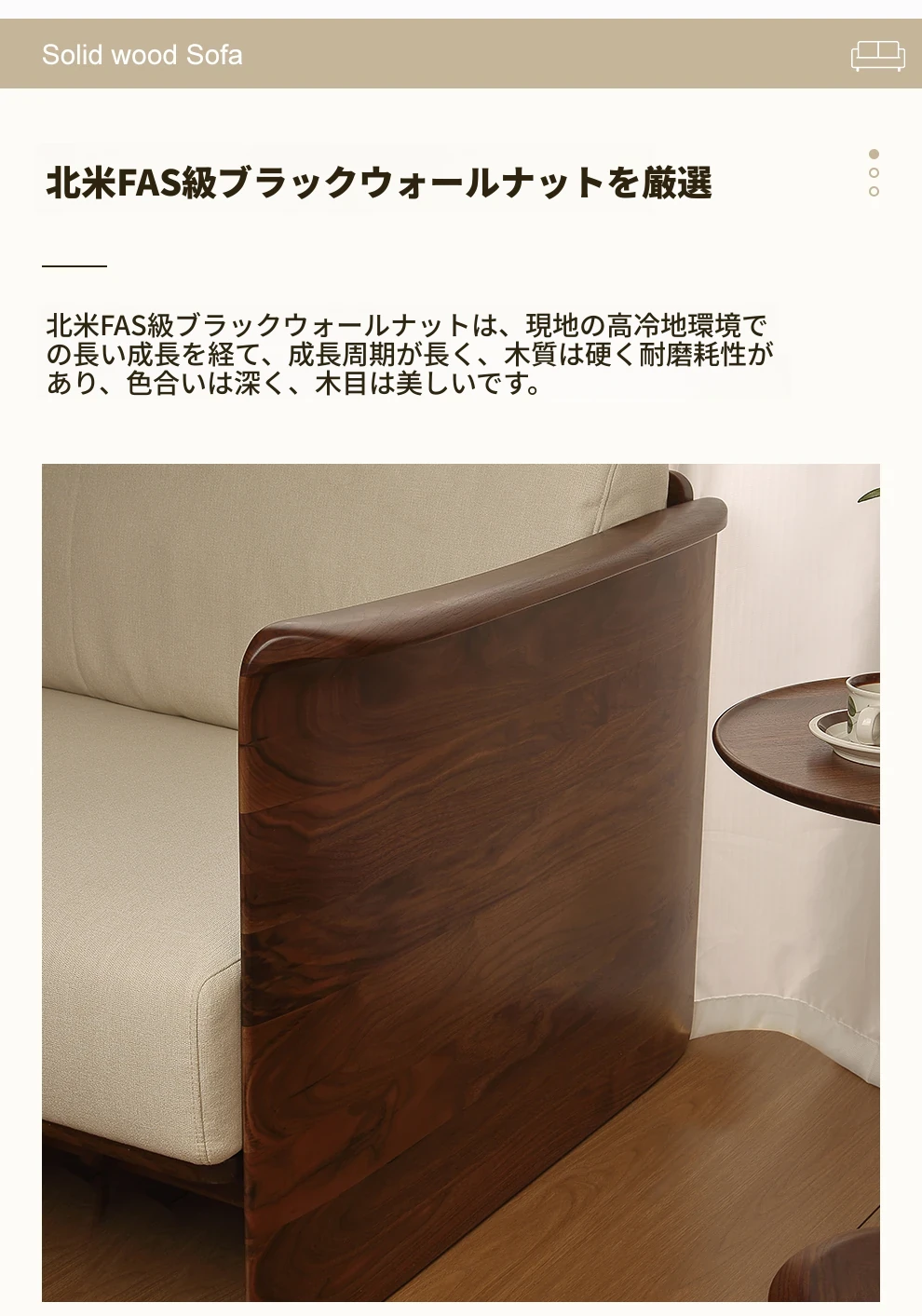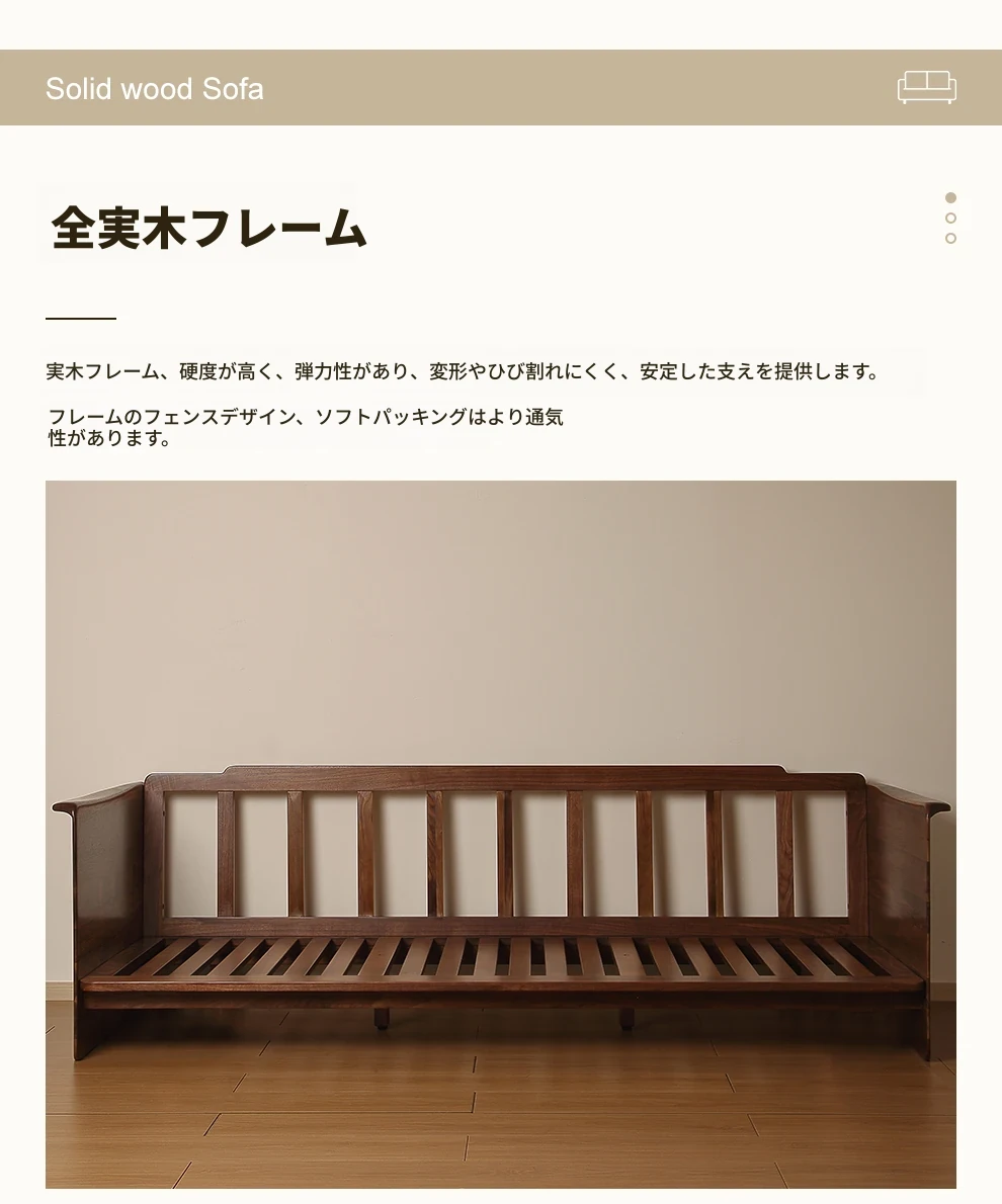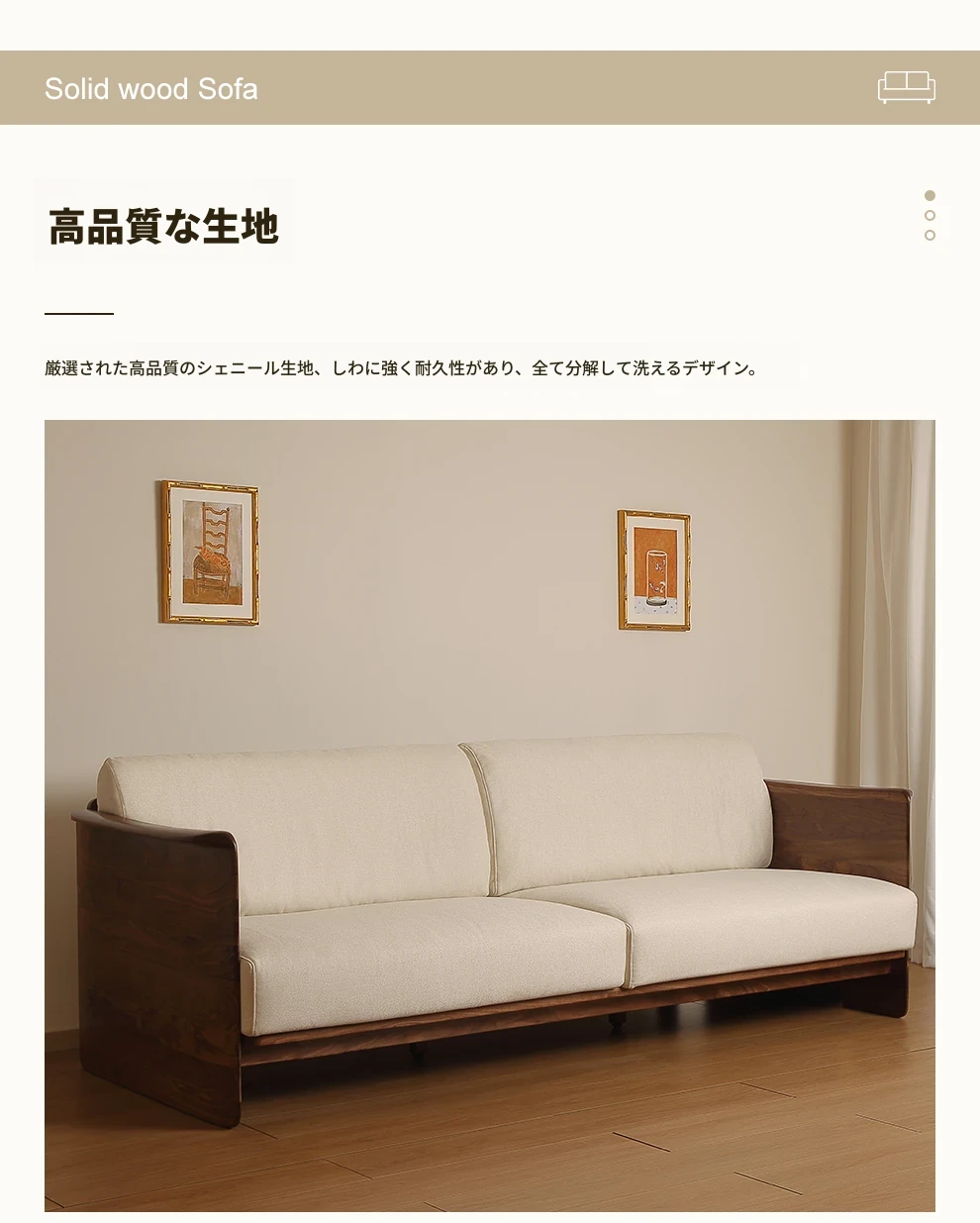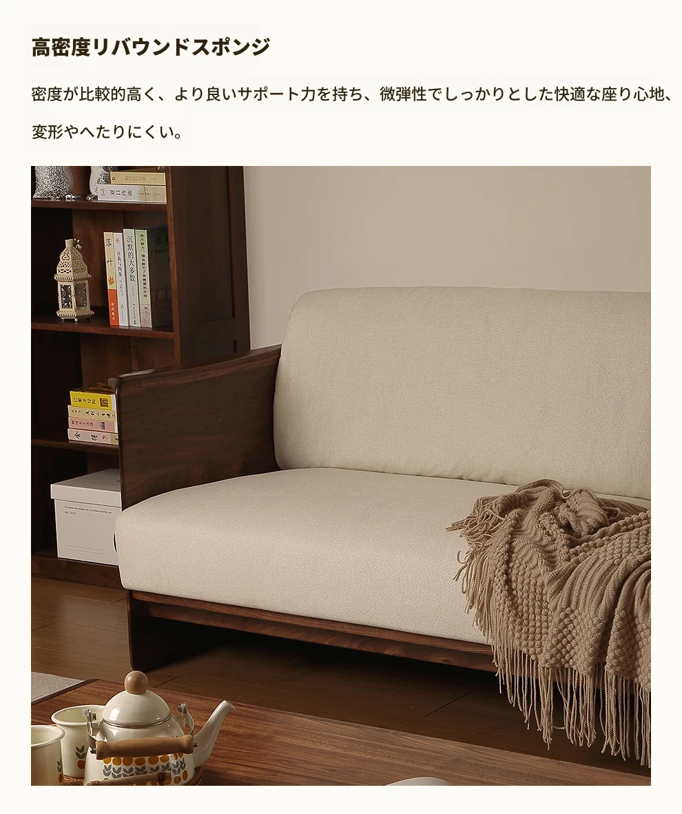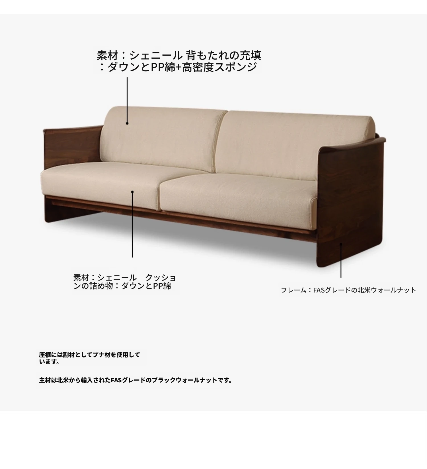 北米産ブラックウォールナットのシンプルなリビングソファ - 天然木の風合いを活かしたモダンデザイン、全実木構造で耐久性抜群!布地の柔らかさが心地よい、スタイリッシュな空間を演出します。