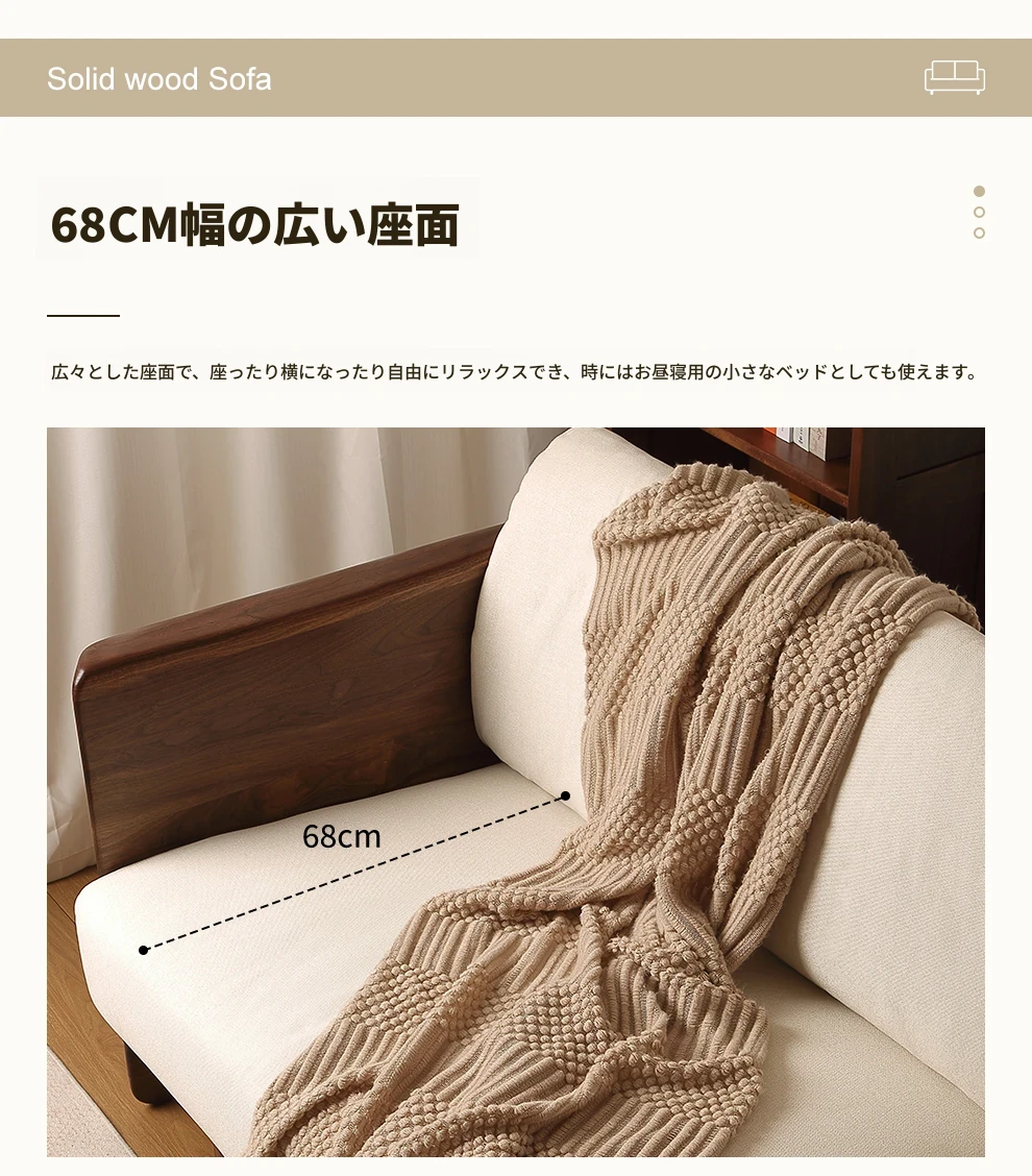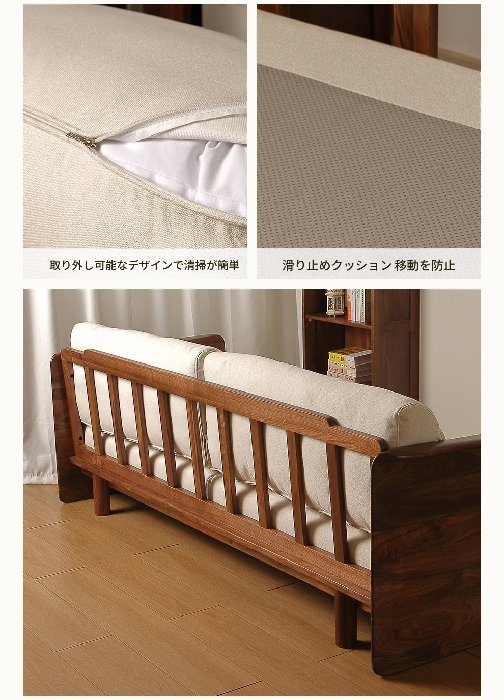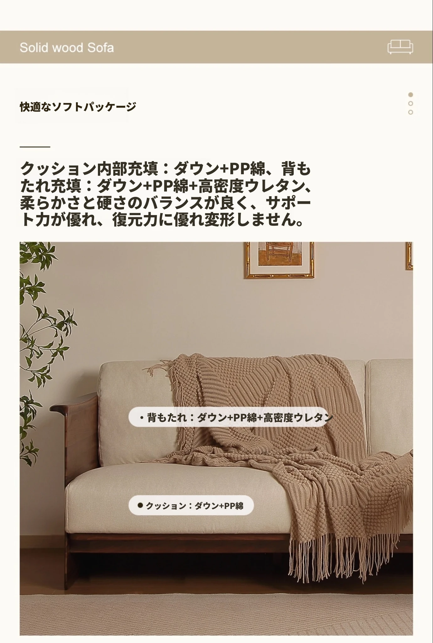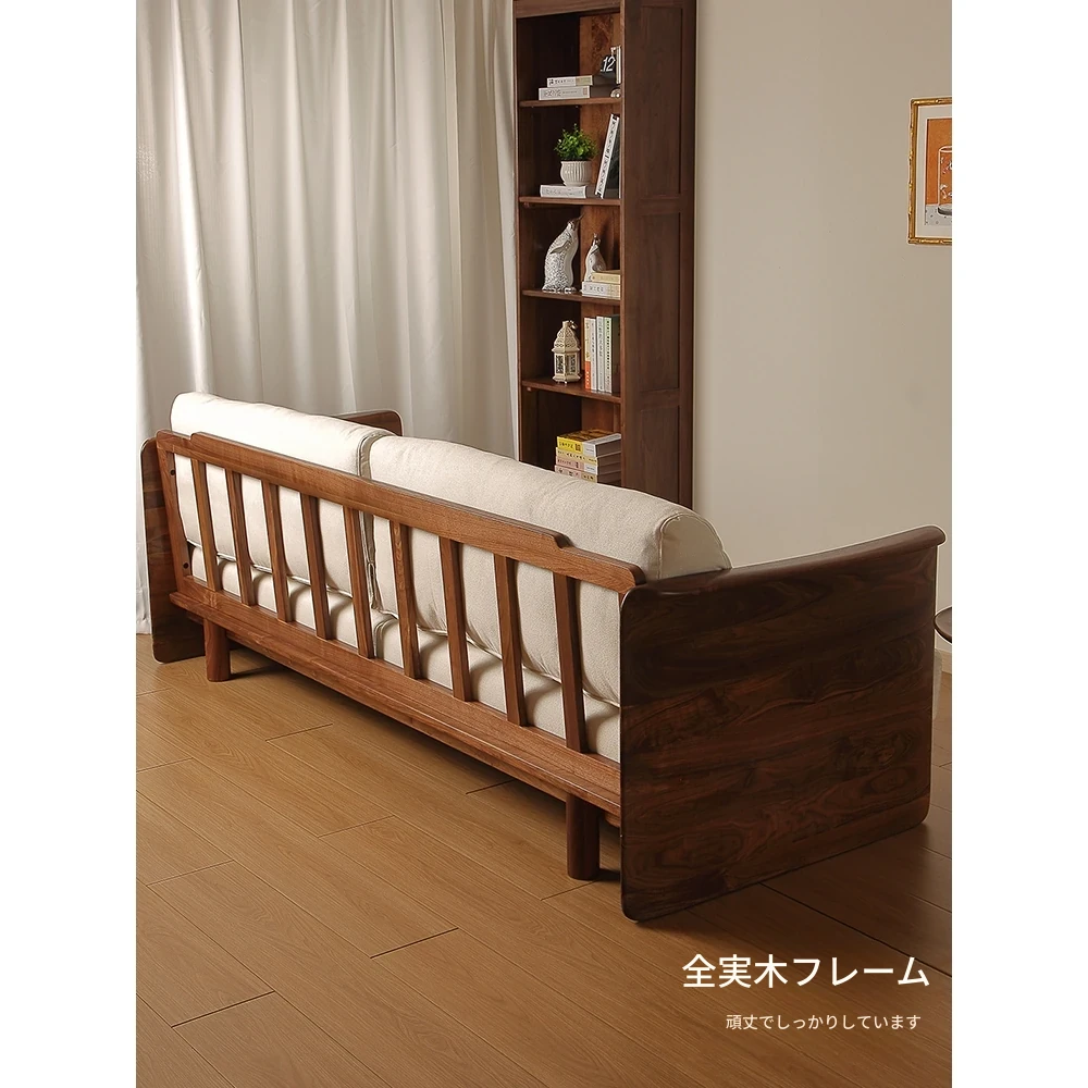 北米産ブラックウォールナットのシンプルなリビングソファ - 天然木の風合いを活かしたモダンデザイン、全実木構造で耐久性抜群!布地の柔らかさが心地よい、スタイリッシュな空間を演出します。